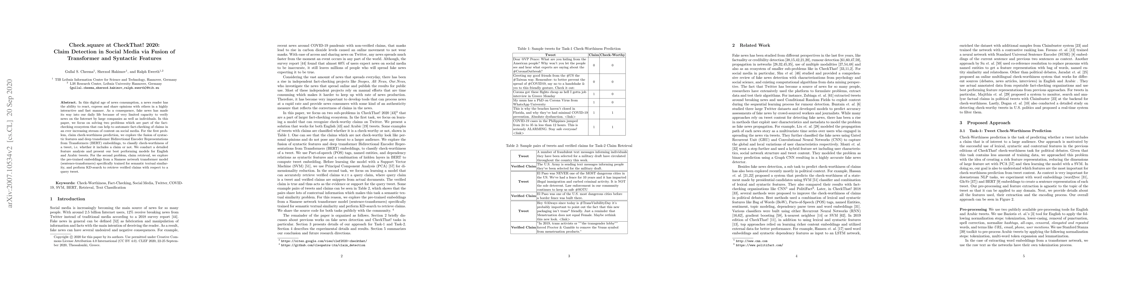 This paper proposes a system to detect fake news on social media by combining transformer models with syntactic features to classify claims as check-worthy or not, and then retrieving verified claims from a database.