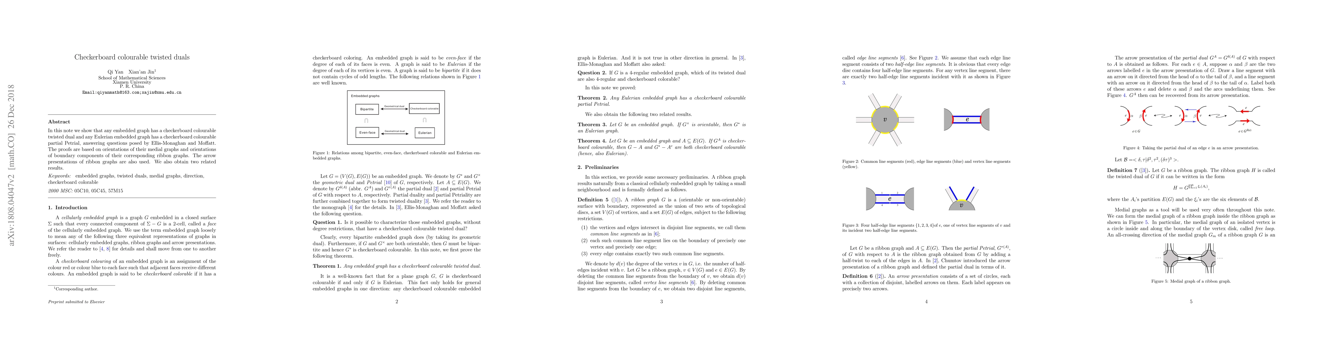 This paper demonstrates that any embedded graph possesses a checkerboard colourable twisted dual, and Eulerian embedded graphs have a checkerboard colourable partial Petrial. The proofs rely on orientations of medial graphs and boundary components of ribbon graphs, along with arrow presentations of these structures. Additionally, two related results are derived.