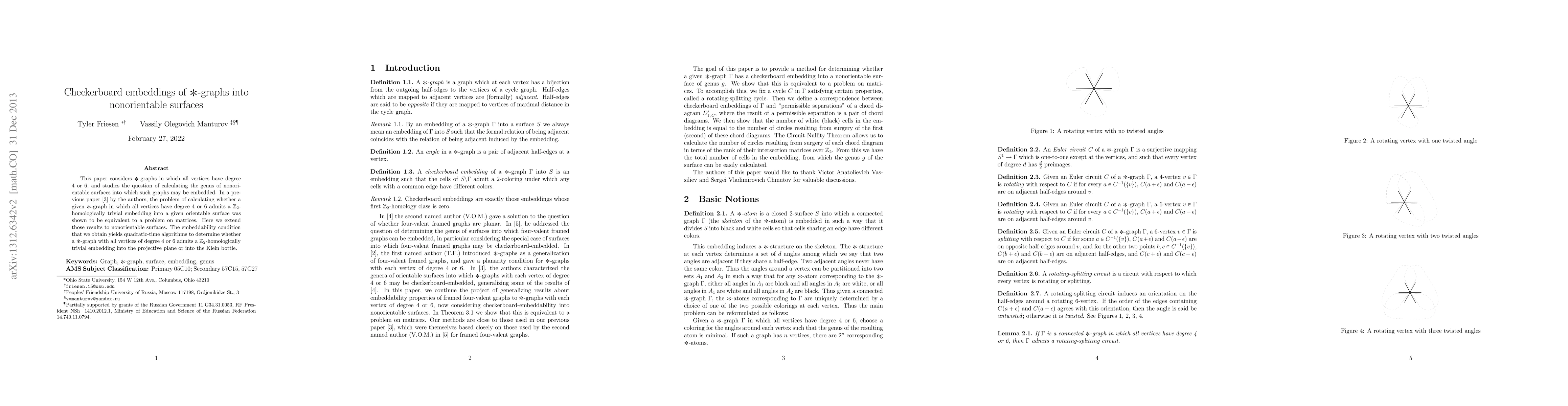 This paper investigates *-graphs with vertices of degree 4 or 6, determining the genus of nonorientable surfaces into which they can be embedded. It extends previous results on orientable surfaces to nonorientable surfaces, providing quadratic-time algorithms for checking embeddability into the projective plane or the Klein bottle.