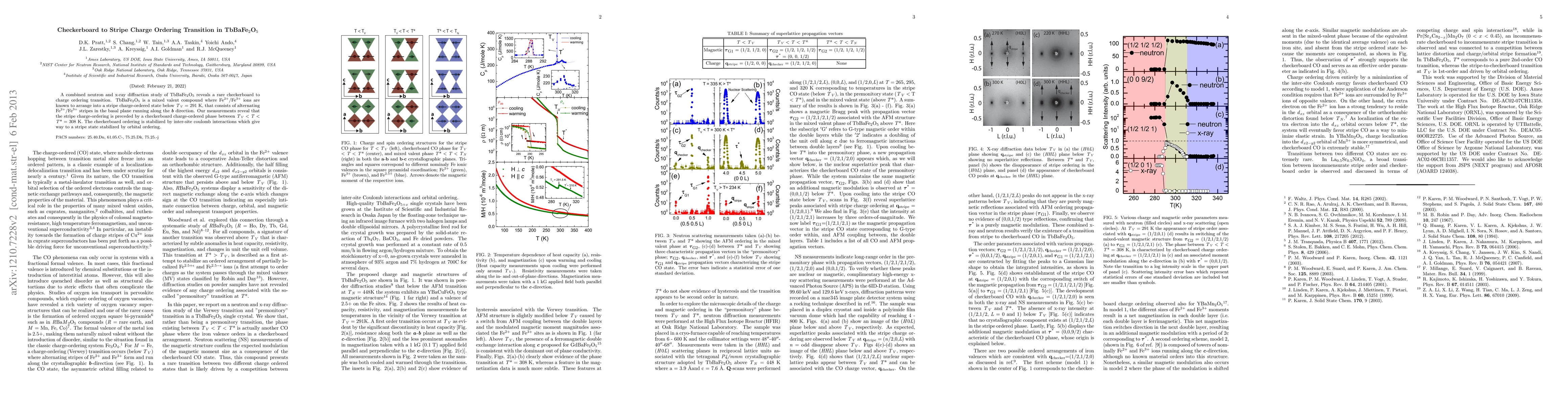 This study investigates the charge ordering transition in TbBaFe2O5, revealing a rare transition from a checkerboard to a stripe charge-ordered state. Neutron and x-ray diffraction show that the checkerboard phase, stabilized by inter-site coulomb interactions, transitions to a stripe phase below 291 K, driven by orbital ordering.