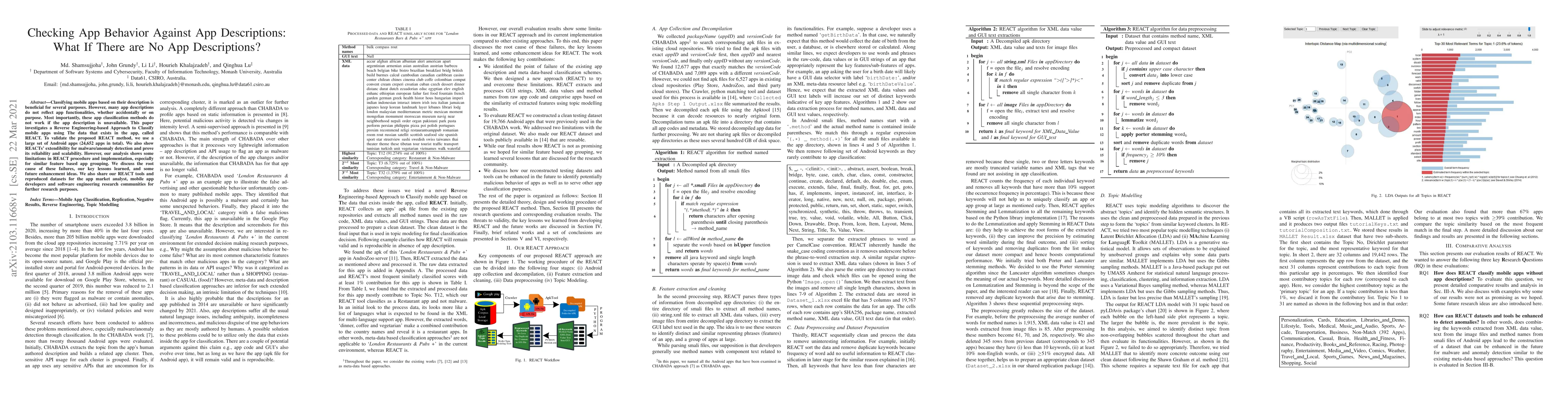 This paper proposes a Reverse Engineering-based Approach (REACT) to classify mobile apps using in-app data when descriptions are unavailable, validated on a dataset of 24,652 Android apps. While demonstrating REACT's potential for malware detection and scalability, the study also identifies limitations in similar feature-based app grouping and suggests future enhancements.