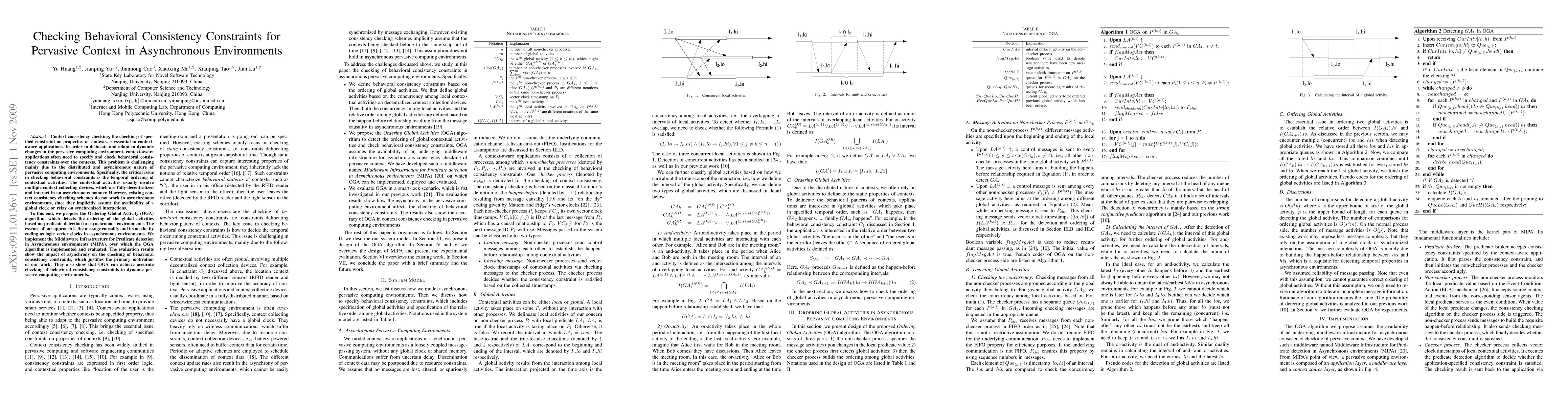 Context consistency checking, the checking of specified constraint on properties of contexts, is essential to context-aware applications. In order to delineate and adapt to dynamic changes in the pervasive computing environment, context-aware applications often need to specify and check behavioral consistency constraints over the contexts. This problem is challenging mainly due to the distributed and asynchronous nature of pervasive computing environments. Specifically, the critical issue in checking behavioral constraints is the temporal ordering of contextual activities. The contextual activities usually involve multiple context collecting devices, which are fully-decentralized and interact in an asynchronous manner. However, existing context consistency checking schemes do not work in asynchronous environments, since they implicitly assume the availability of a global clock or relay on synchronized interactions. To this end, we propose the Ordering Global Activity (OGA) algorithm, which detects the ordering of the global activities based on predicate detection in asynchronous environments. The essence of our approach is the message causality and its on-the-fly coding as logic vector clocks in asynchronous environments. We implement the Middleware Infrastructure for Predicate detection in Asynchronous environments (MIPA), over which the OGA algorithm is implemented and evaluated. The evaluation results show the impact of asynchrony on the checking of behavioral consistency constraints, which justifies the primary motivation of our work. They also show that OGA can achieve accurate checking of behavioral consistency constraints in dynamic pervasive computing environments.