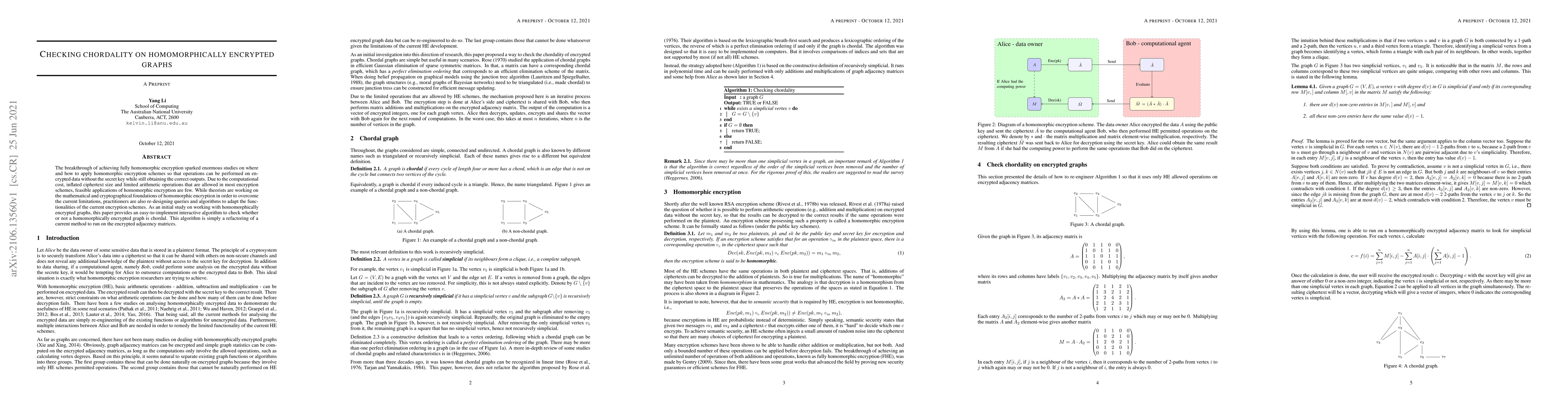 This paper presents an interactive algorithm for checking chordality on homomorphically encrypted graphs, aiming to adapt current encryption schemes to handle graph-related queries efficiently. The algorithm refactors existing methods to operate on encrypted adjacency matrices, contributing to the practical application of homomorphic encryption.