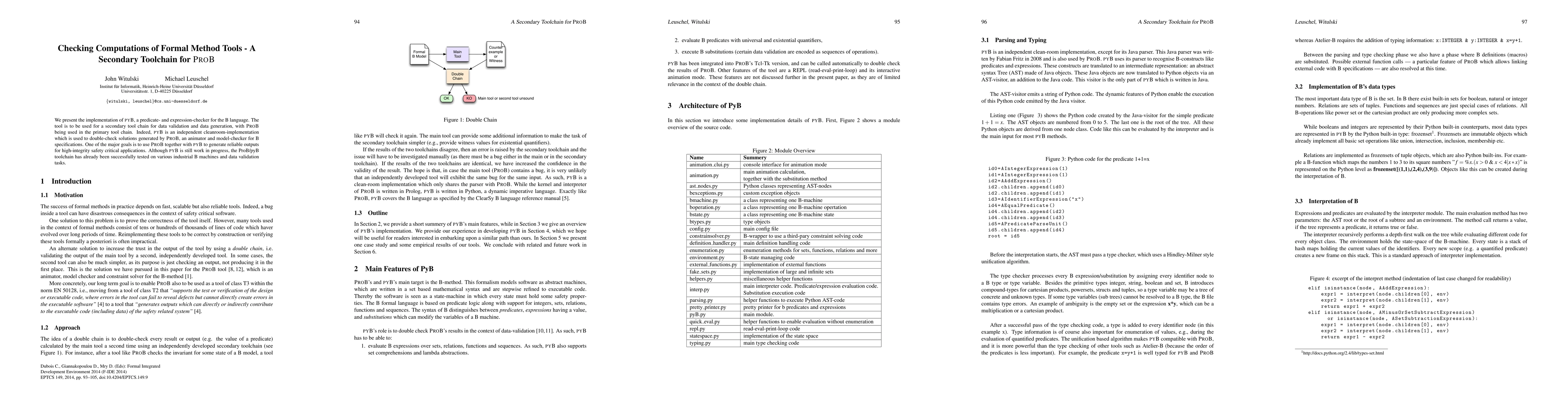 Summary: We introduce pyB, a B language predicate and expression checker, designed as a secondary toolchain to validate and generate data for ProB. This independent implementation aims to double-check ProB's outputs, enhancing reliability for safety-critical applications, and has been tested successfully in industrial settings.