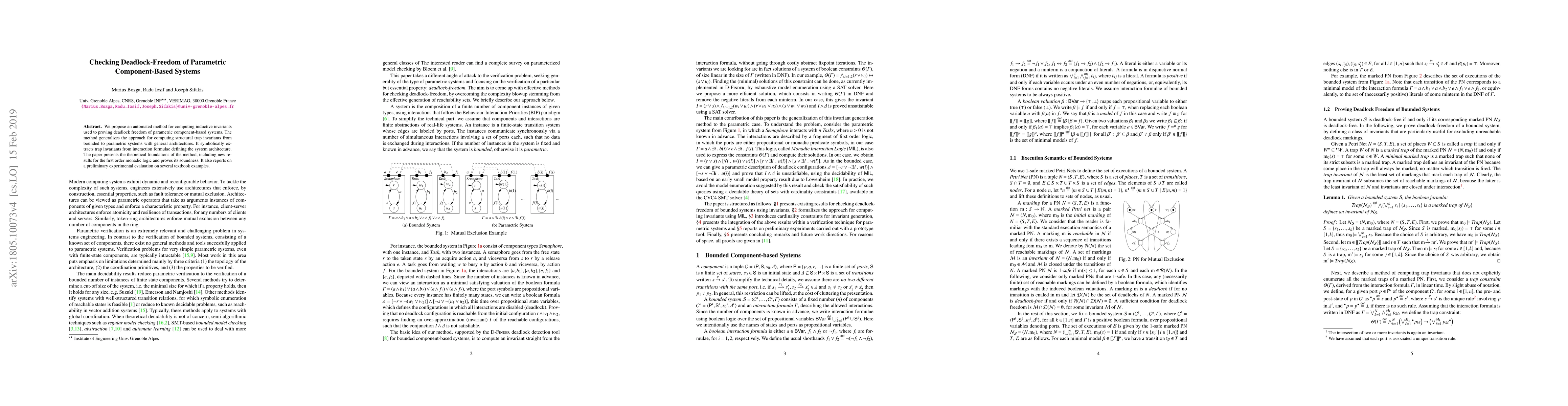 This paper introduces an automated method for verifying deadlock-freedom in parametric component-based systems by computing inductive invariants, extending structural trap invariant techniques to general architectures. The approach is theoretically grounded in first-order monadic logic and demonstrated through preliminary examples.