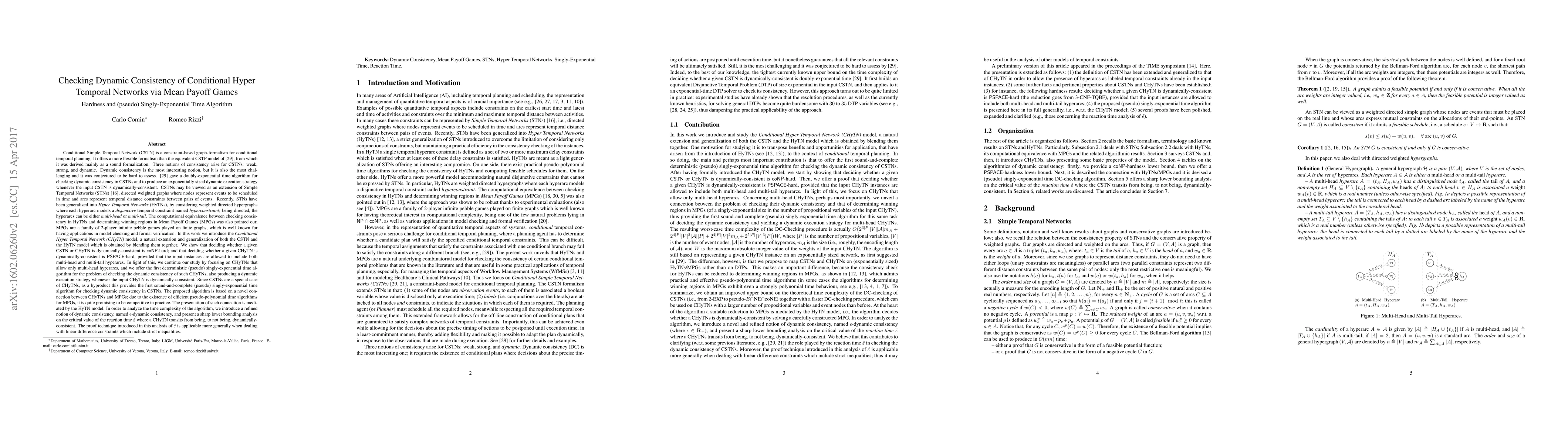 In this work we introduce the \emph{Conditional Hyper Temporal Network (CHyTN)} model, which is a natural extension and generalization of both the \CSTN and the \HTN model. Our contribution goes as follows. We show that deciding whether a given \CSTN or CHyTN is dynamically consistent is \coNP-hard. Then, we offer a proof that deciding whether a given CHyTN is dynamically consistent is \PSPACE-hard, provided that the input instances are allowed to include both multi-head and multi-tail hyperarcs. In light of this, we continue our study by focusing on CHyTNs that allow only multi-head or only multi-tail hyperarcs, and we offer the first deterministic (pseudo) singly-exponential time algorithm for the problem of checking the dynamic-consistency of such CHyTNs, also producing a dynamic execution strategy whenever the input CHyTN is dynamically consistent. Since \CSTN{s} are a special case of CHyTNs, this provides as a byproduct the first sound-and-complete (pseudo) singly-exponential time algorithm for checking dynamic-consistency in CSTNs. The proposed algorithm is based on a novel connection between CSTN{s}/CHyTN{s} and Mean Payoff Games. The presentation of the connection between \CSTN{s}/CHyTNs and \MPG{s} is mediated by the \HTN model. In order to analyze the algorithm, we introduce a refined notion of dynamic-consistency, named $\epsilon$-dynamic-consistency, and present a sharp lower bounding analysis on the critical value of the reaction time $\hat{\varepsilon}$ where a \CSTN/CHyTN transits from being, to not being, dynamically consistent. The proof technique introduced in this analysis of $\hat{\varepsilon}$ is applicable more generally when dealing with linear difference constraints which include strict inequalities.