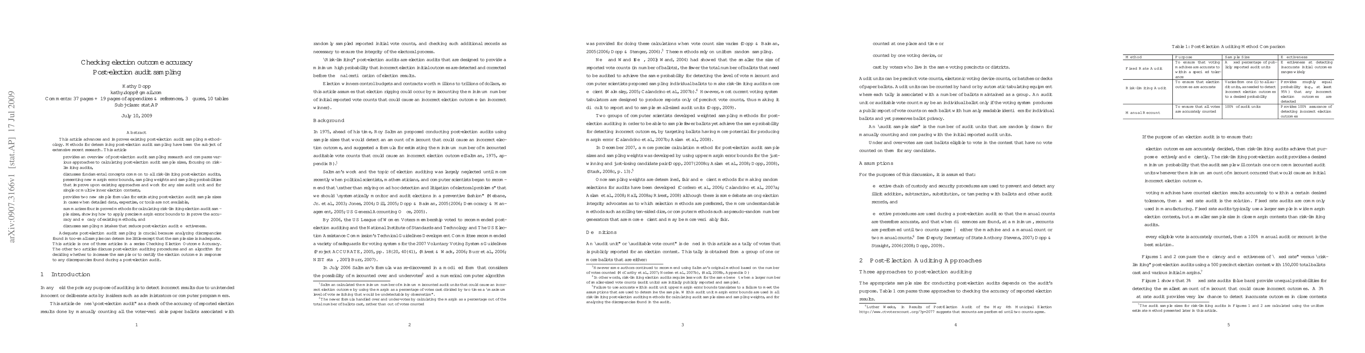 This article * provides an overview of post-election audit sampling research and compares various approaches to calculating post-election audit sample sizes, focusing on risklimiting audits, * discusses fundamental concepts common to all risk-limiting post-election audits, presenting new margin error bounds, sampling weights and sampling probabilities that improve upon existing approaches and work for any size audit unit and for single or multi-winner election contests, * provides two new simple formulas for estimating post-election audit sample sizes in cases when detailed data, expertise, or tools are not available, * summarizes four improved methods for calculating risk-limiting election audit sample sizes, showing how to apply precise margin error bounds to improve the accuracy and efficacy of existing methods, and * discusses sampling mistakes that reduce post-election audit effectiveness.