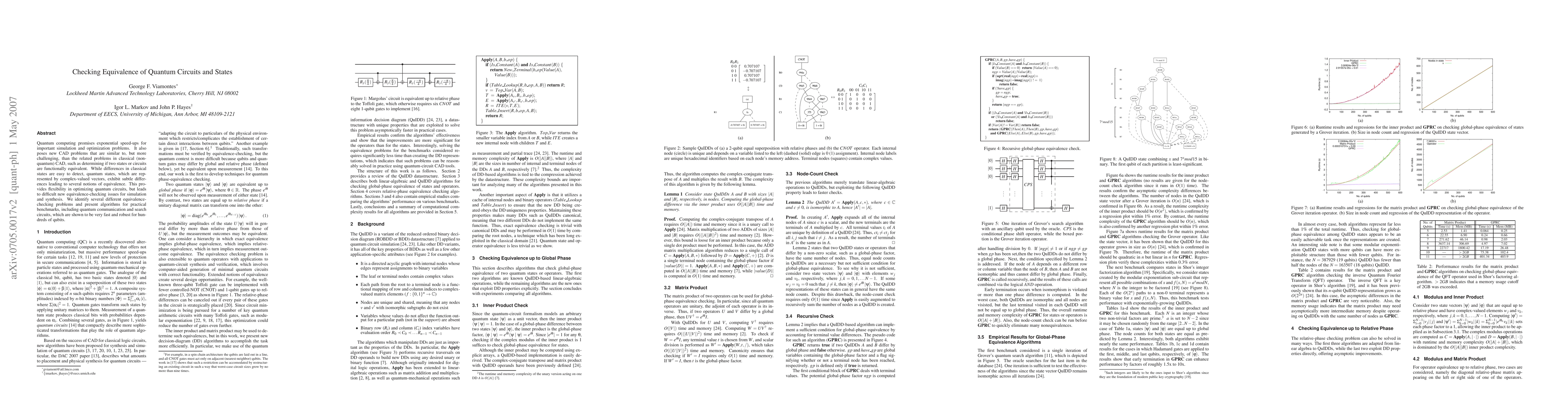 Quantum computing promises exponential speed-ups for important simulation and optimization problems. It also poses new CAD problems that are similar to, but more challenging, than the related problems in classical (non-quantum) CAD, such as determining if two states or circuits are functionally equivalent. While differences in classical states are easy to detect, quantum states, which are represented by complex-valued vectors, exhibit subtle differences leading to several notions of equivalence. This provides flexibility in optimizing quantum circuits, but leads to difficult new equivalence-checking issues for simulation and synthesis. We identify several different equivalence-checking problems and present algorithms for practical benchmarks, including quantum communication and search circuits, which are shown to be very fast and robust for hundreds of qubits.