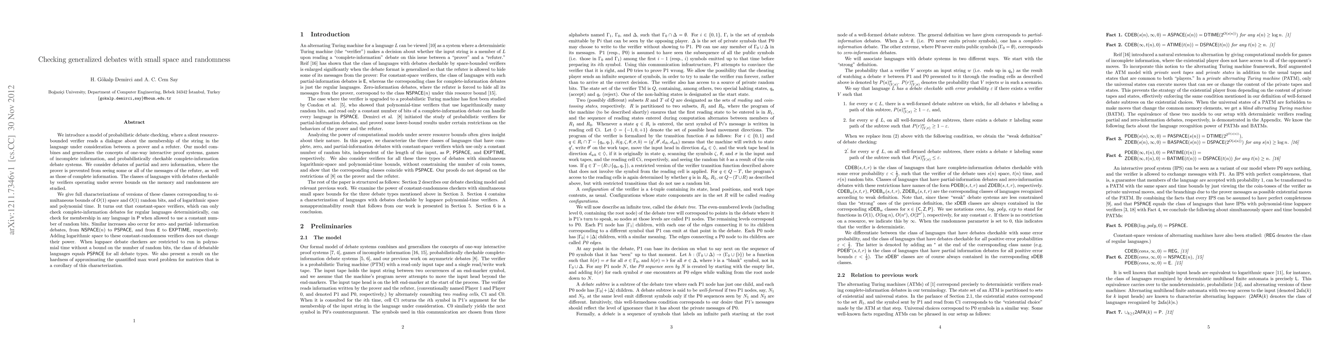 A new model of probabilistic debate checking enables verifiers to efficiently check debates for membership in languages with limited space and randomness, leading to characterizations of the power of constant-space verifiers in various classes.