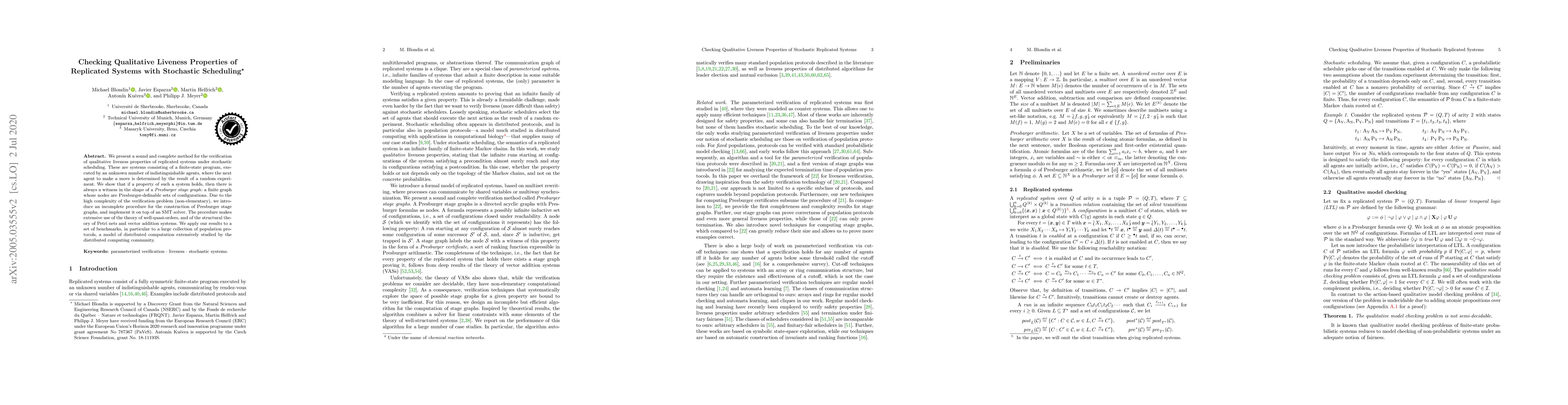We present a sound and complete method for the verification of qualitative liveness properties of replicated systems under stochastic scheduling. These are systems consisting of a finite-state program, executed by an unknown number of indistinguishable agents, where the next agent to make a move is determined by the result of a random experiment. We show that if a property of such a system holds, then there is always a witness in the shape of a Presburger stage graph: a finite graph whose nodes are Presburger-definable sets of configurations. Due to the high complexity of the verification problem (non-elementary), we introduce an incomplete procedure for the construction of Presburger stage graphs, and implement it on top of an SMT solver. The procedure makes extensive use of the theory of well-quasi-orders, and of the structural theory of Petri nets and vector addition systems. We apply our results to a set of benchmarks, in particular to a large collection of population protocols, a model of distributed computation extensively studied by the distributed computing community.