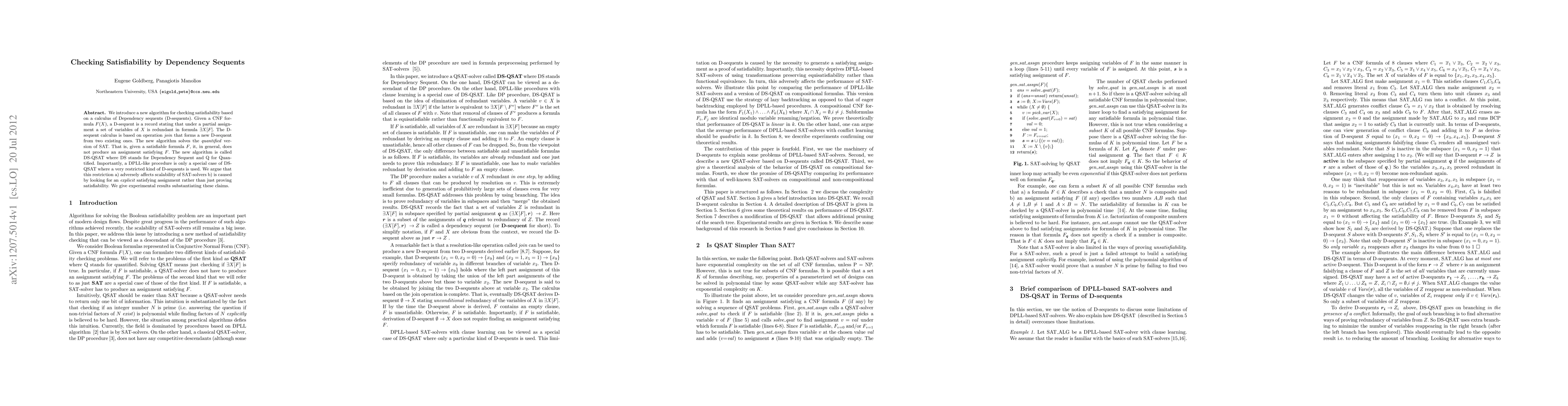 The paper introduces a new DS-QSAT algorithm for checking satisfiability using Dependency sequents, which identifies redundant variable sets in CNF formulas without necessarily producing a satisfying assignment. Unlike DPLL-based methods, it offers potentially better scalability by not requiring explicit solutions.