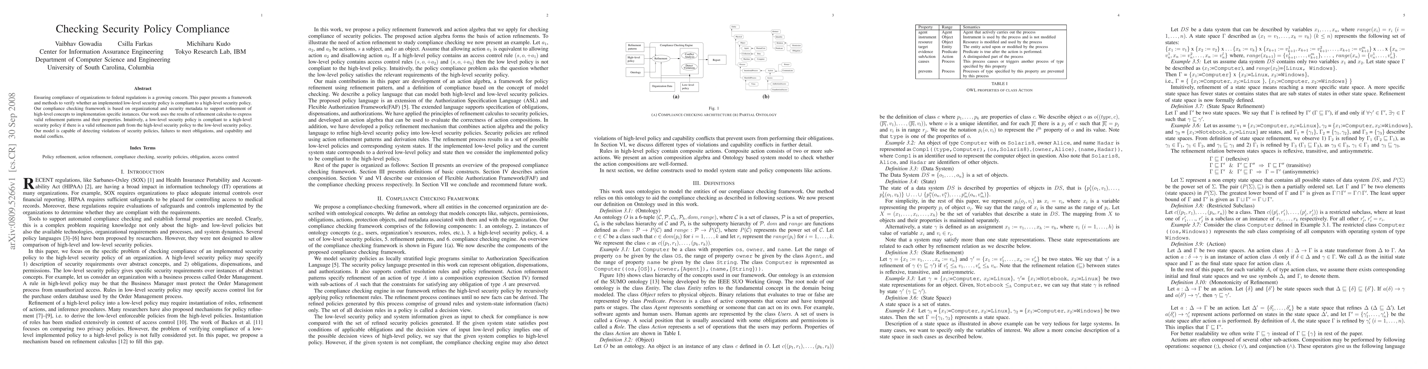 Ensuring compliance of organizations to federal regulations is a growing concern. This paper presents a framework and methods to verify whether an implemented low-level security policy is compliant to a high-level security policy. Our compliance checking framework is based on organizational and security metadata to support refinement of high-level concepts to implementation specific instances. Our work uses the results of refinement calculus to express valid refinement patterns and their properties. Intuitively, a low-level security policy is compliant to a high-level security policy if there is a valid refinement path from the high-level security policy to the low-level security policy. Our model is capable of detecting violations of security policies, failures to meet obligations, and capability and modal conflicts.