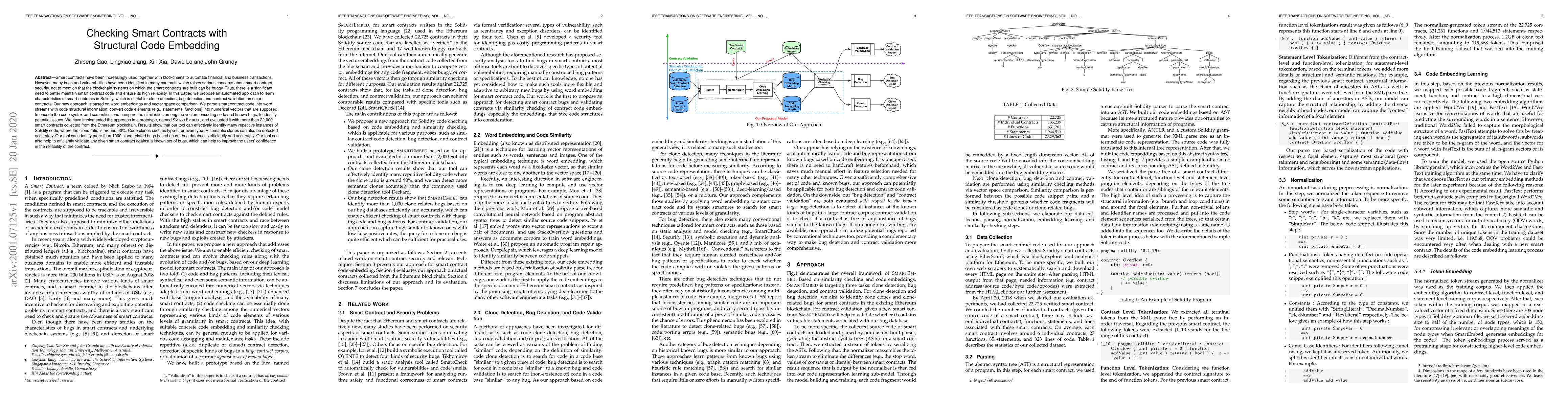 Smart contracts have been increasingly used together with blockchains to automate financial and business transactions. However, many bugs and vulnerabilities have been identified in many contracts which raises serious concerns about smart contract security, not to mention that the blockchain systems on which the smart contracts are built can be buggy. Thus, there is a significant need to better maintain smart contract code and ensure its high reliability. In this paper, we propose an automated approach to learn characteristics of smart contracts in Solidity, which is useful for clone detection, bug detection and contract validation on smart contracts. Our new approach is based on word embeddings and vector space comparison. We parse smart contract code into word streams with code structural information, convert code elements (e.g., statements, functions) into numerical vectors that are supposed to encode the code syntax and semantics, and compare the similarities among the vectors encoding code and known bugs, to identify potential issues. We have implemented the approach in a prototype, named SmartEmbed. Results show that our tool can effectively identify many repetitive instances of Solidity code, where the clone ratio is around 90\%. Code clones such as type-III or even type-IV semantic clones can also be detected accurately. Our tool can identify more than 1000 clone related bugs based on our bug databases efficiently and accurately. Our tool can also help to efficiently validate any given smart contract against a known set of bugs, which can help to improve the users' confidence in the reliability of the contract. The anonymous replication packages can be accessed at: https://drive.google.com/file/d/1kauLT3y2IiHPkUlVx4FSTda-dVAyL4za/view?usp=sharing, and evaluated it with more than 22,000 smart contracts collected from the Ethereum blockchain.