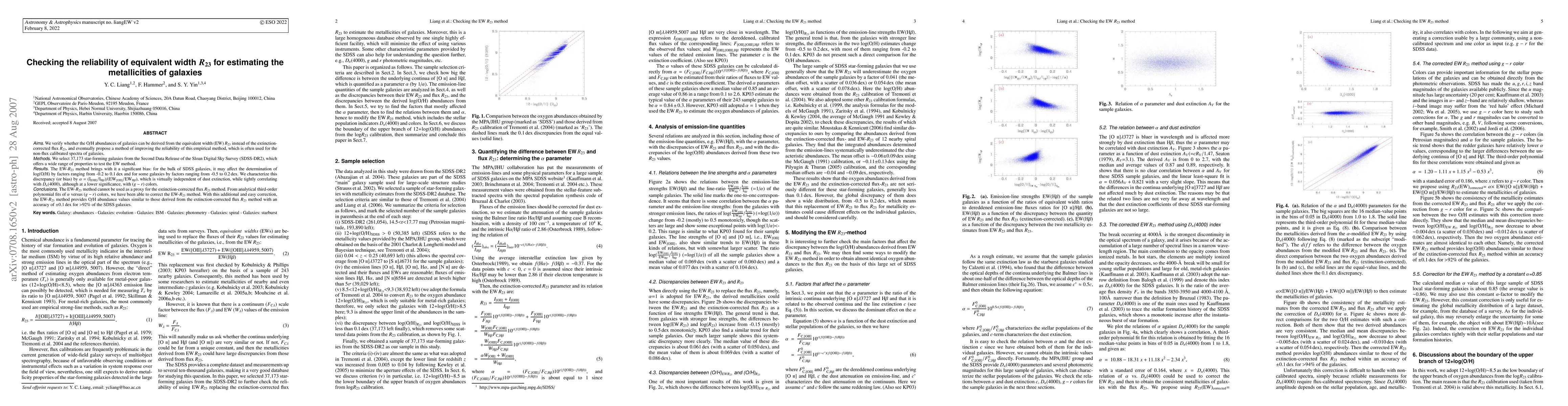 We verify whether the O/H abundances of galaxies can be derived from the equivalent width (EW) R23 instead of the extinction-corrected flux R23, and eventually propose a method of improving the reliability of this empirical method, which is often used for the non-flux calibrated spectra of galaxies. We select 37,173 star-forming galaxies from the SDSS-DR2, which offers a wide range of properties to test the EW method. The EW-R23 method brings with it a significant bias: for the bulk of SDSS galaxies, it may affect the determination of log(O/H) by factors ranging from -0.2 to 0.1 dex and for some galaxies by factors ranging from -0.5 to 0.2 dex. We characterize this discrepancy (or bias) by alpha = (I_[OII]/I_Hbeta)/(EW_[OII]/EW_Hbeta), which is virtually independent of dust extinction, while tightly correlating with Dn(4000), although at a lower significance, with (g-r) colors. The EW-R23 method cannot be used as a proxy for the extinction-corrected flux R23 method. From analytical third-order polynomial fits of alpha versus (g-r) colors, we have been able to correct the EW-R23 method. With this additional and easy correction, the EW-R23 method provides O/H abundance values similar to those derived from the extinction-corrected flux R23 method with an accuracy of ~0.1 dex for >92% of the SDSS galaxies.