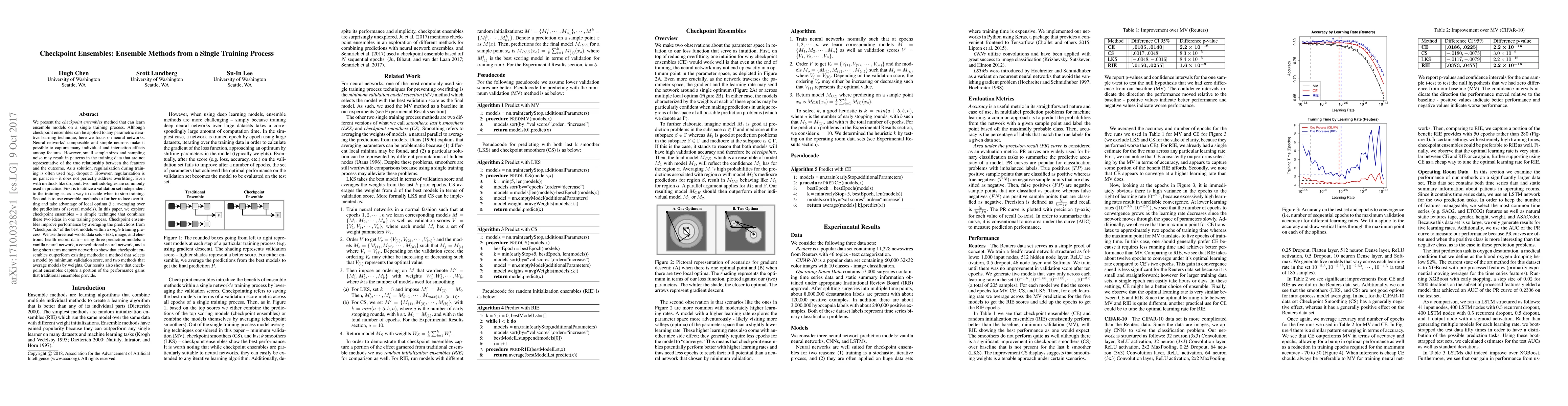 We present the checkpoint ensembles method that can learn ensemble models on a single training process. Although checkpoint ensembles can be applied to any parametric iterative learning technique, here we focus on neural networks. Neural networks' composable and simple neurons make it possible to capture many individual and interaction effects among features. However, small sample sizes and sampling noise may result in patterns in the training data that are not representative of the true relationship between the features and the outcome. As a solution, regularization during training is often used (e.g. dropout). However, regularization is no panacea -- it does not perfectly address overfitting. Even with methods like dropout, two methodologies are commonly used in practice. First is to utilize a validation set independent to the training set as a way to decide when to stop training. Second is to use ensemble methods to further reduce overfitting and take advantage of local optima (i.e. averaging over the predictions of several models). In this paper, we explore checkpoint ensembles -- a simple technique that combines these two ideas in one training process. Checkpoint ensembles improve performance by averaging the predictions from "checkpoints" of the best models within single training process. We use three real-world data sets -- text, image, and electronic health record data -- using three prediction models: a vanilla neural network, a convolutional neural network, and a long short term memory network to show that checkpoint ensembles outperform existing methods: a method that selects a model by minimum validation score, and two methods that average models by weights. Our results also show that checkpoint ensembles capture a portion of the performance gains that traditional ensembles provide.