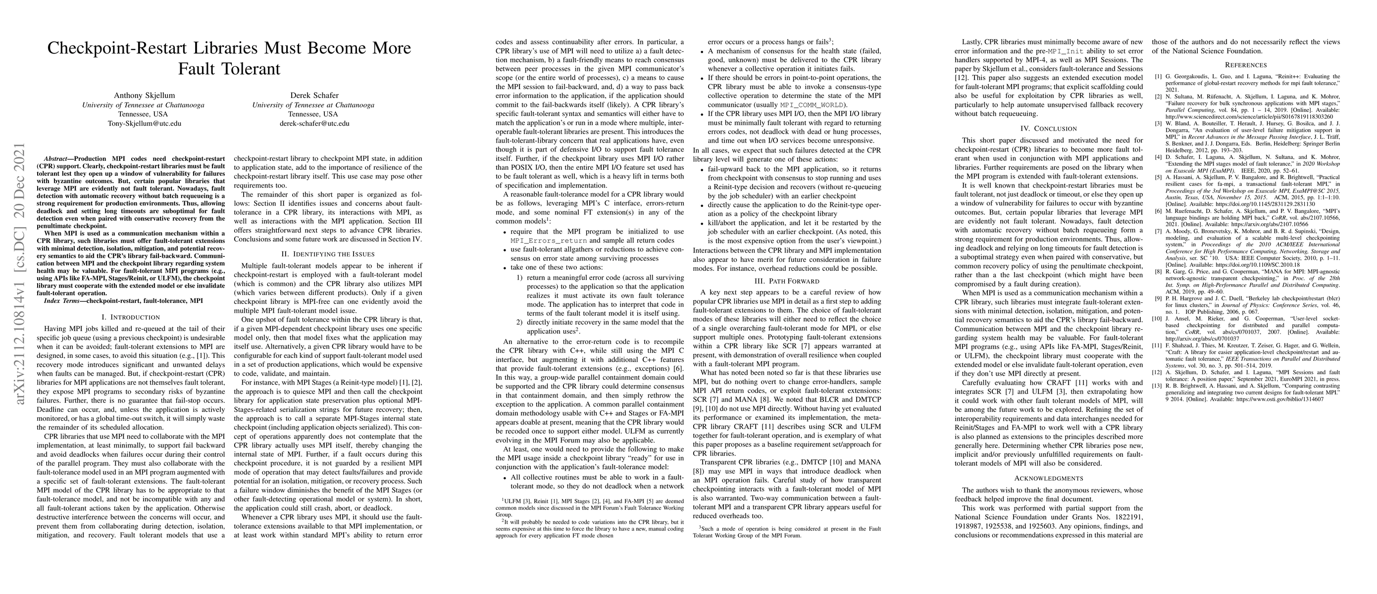 Production MPI codes need checkpoint-restart (CPR) support. Clearly, checkpoint-restart libraries must be fault tolerant lest they open up a window of vulnerability for failures with byzantine outcomes. But, certain popular libraries that leverage MPI are evidently not fault tolerant. Nowadays, fault detection with automatic recovery without batch requeueing is a strong requirement for production environments. Thus, allowing deadlock and setting long timeouts are suboptimal for fault detection even when paired with conservative recovery from the penultimate checkpoint. When MPI is used as a communication mechanism within a CPR library, such libraries must offer fault-tolerant extensions with minimal detection, isolation, mitigation, and potential recovery semantics to aid the CPR's library fail-backward. Communication between MPI and the checkpoint library regarding system health may be valuable. For fault-tolerant MPI programs (e.g., using APIs like FA-MPI, Stages/Reinit, or ULFM), the checkpoint library must cooperate with the extended model or else invalidate fault-tolerant operation.