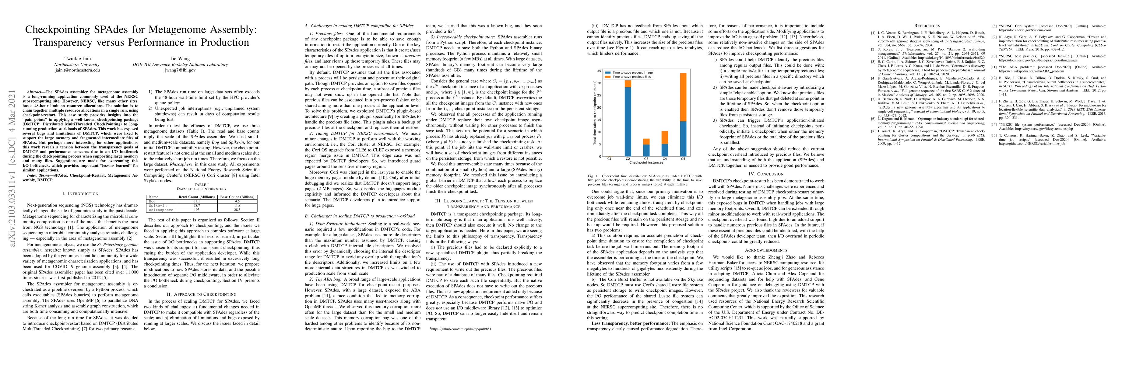 The SPAdes assembler for metagenome assembly is a long-running application commonly used at the NERSC supercomputing site. However, NERSC, like many other sites, has a 48-hour limit on resource allocations. The solution is to chain together multiple resource allocations in a single run, using checkpoint-restart. This case study provides insights into the "pain points" in applying a well-known checkpointing package (DMTCP: Distributed MultiThreaded CheckPointing) to long-running production workloads of SPAdes. This work has exposed several bugs and limitations of DMTCP, which were fixed to support the large memory and fragmented intermediate files of SPAdes. But perhaps more interesting for other applications, this work reveals a tension between the transparency goals of DMTCP and performance concerns due to an I/O bottleneck during the checkpointing process when supporting large memory and many files. Suggestions are made for overcoming this I/O bottleneck, which provides important "lessons learned" for similar applications.