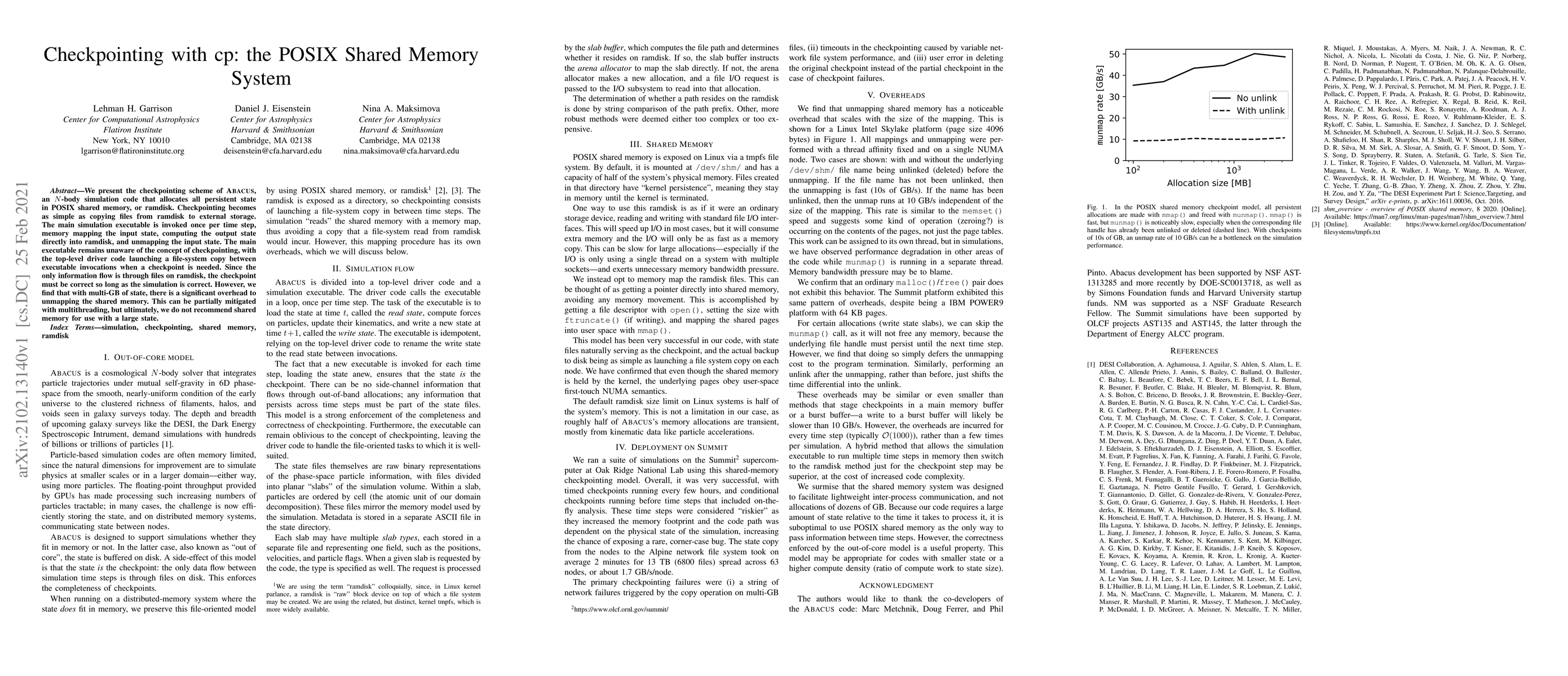 This paper introduces a checkpointing method for an $N$-body simulation using POSIX shared memory, where the state is stored in a ramdisk. The simulation runs independently of checkpointing, with the driver managing file copies for checkpoints, but notes significant overhead in unmapping large shared memory states.