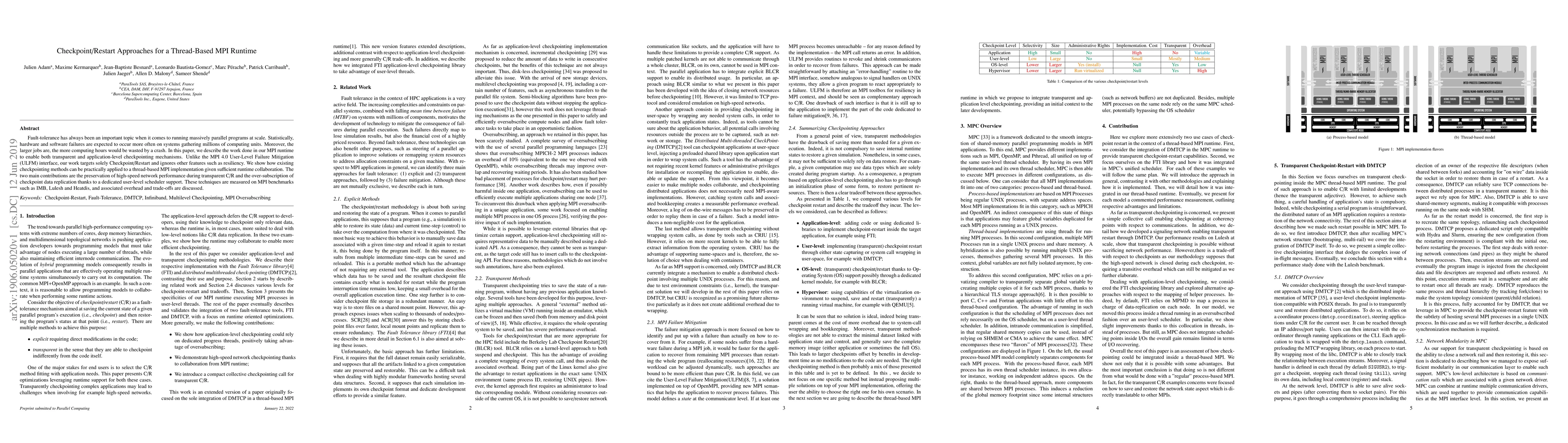 The paper presents a thread-based MPI runtime, MPC, with transparent checkpoint/restart capabilities using DMTCP and a multi-rail network engine. It defines a collective checkpoint interface for transparent checkpointing in MPI runtimes and demonstrates reduced performance overhead with the proposed approach.