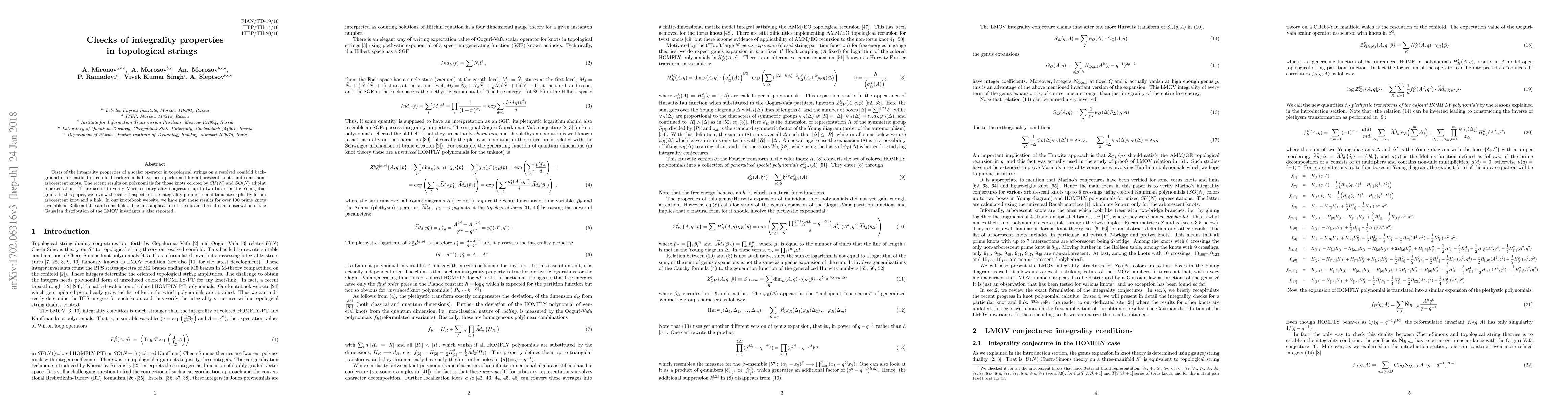 This paper reviews integrality properties of scalar operators in topological strings on conifold backgrounds, verifies Marino's conjecture for specific knots, and tabulates results for over 100 prime knots. It also reports the observation of a Gaussian distribution in LMOV invariants.