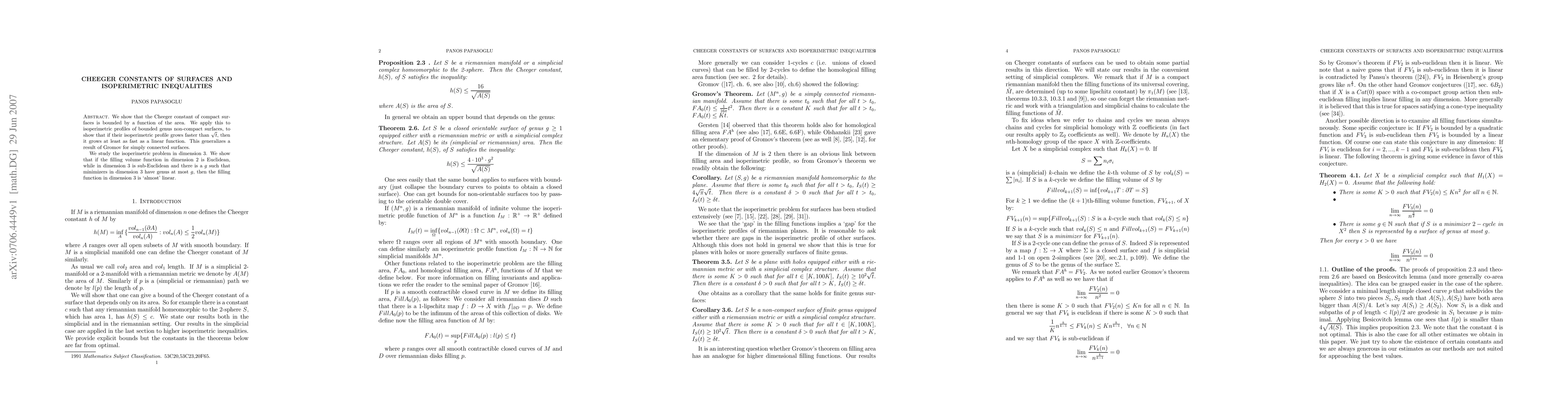 This paper establishes bounds for the Cheeger constant on compact surfaces in relation to their area and applies these bounds to isoperimetric inequalities for non-compact surfaces, showing that faster-than-$\sqrt t$ growth in the isoperimetric profile implies linear growth. It also extends these results to dimension 3, proving that certain conditions on filling volumes lead to a nearly linear filling function.