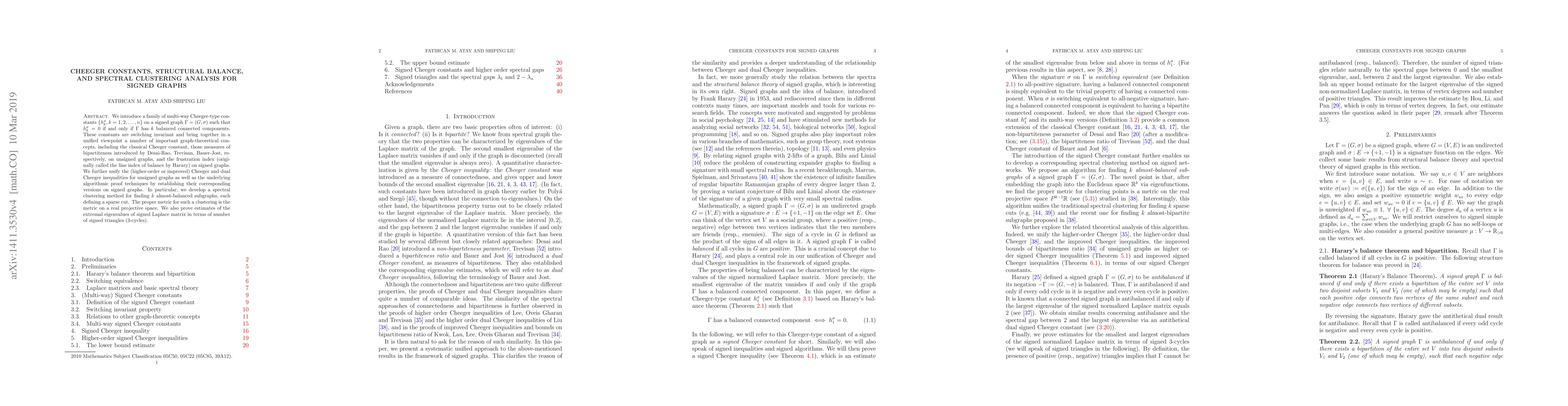 This paper introduces multi-way Cheeger-type constants for signed graphs that unify various graph-theoretical concepts and develop a spectral clustering method for identifying almost-balanced subgraphs, using the metric on a real projective space. It also provides estimates for extremal eigenvalues of the signed Laplace matrix in terms of signed triangles.