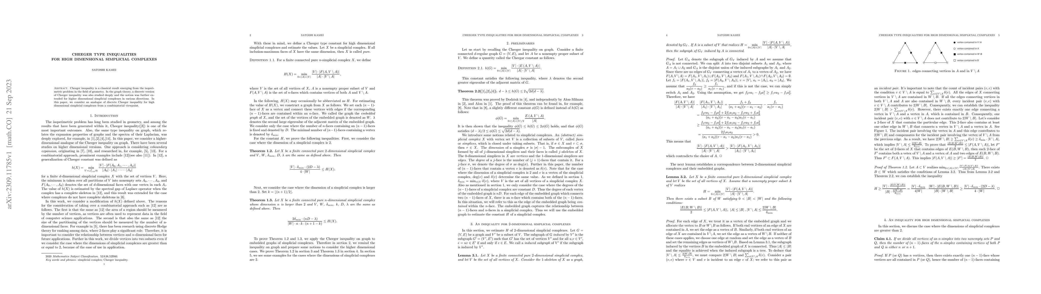 This paper explores a combinatorial version of the Cheeger inequality for high-dimensional simplicial complexes, extending discrete analogs previously studied in graph theory. The focus is on establishing a discrete Cheeger type inequality within this more complex geometric structure.