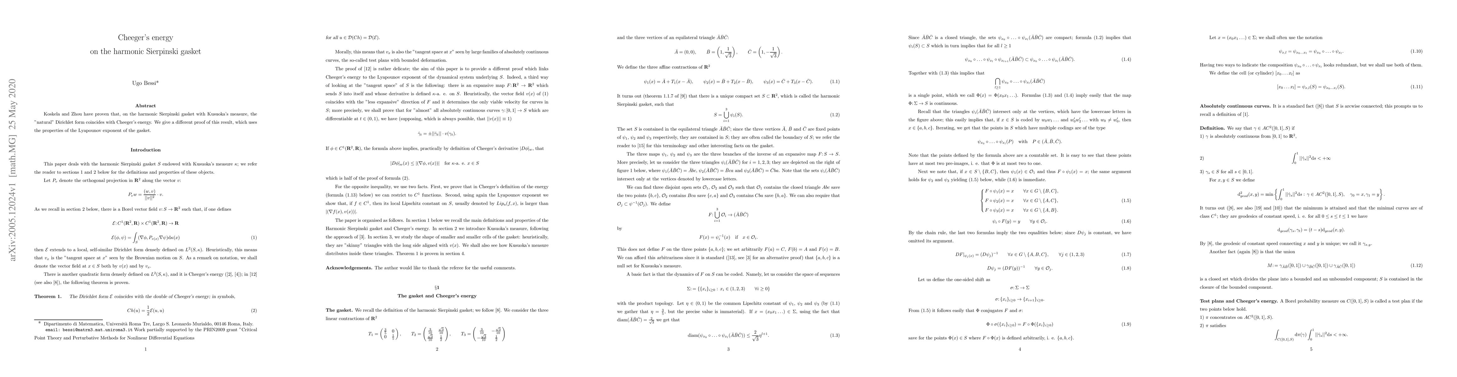 Summary: This paper provides an alternative proof that Cheeger's energy matches the natural Dirichlet form on the harmonic Sierpinski gasket, leveraging the Lyapounov exponent properties instead of the previous approach.