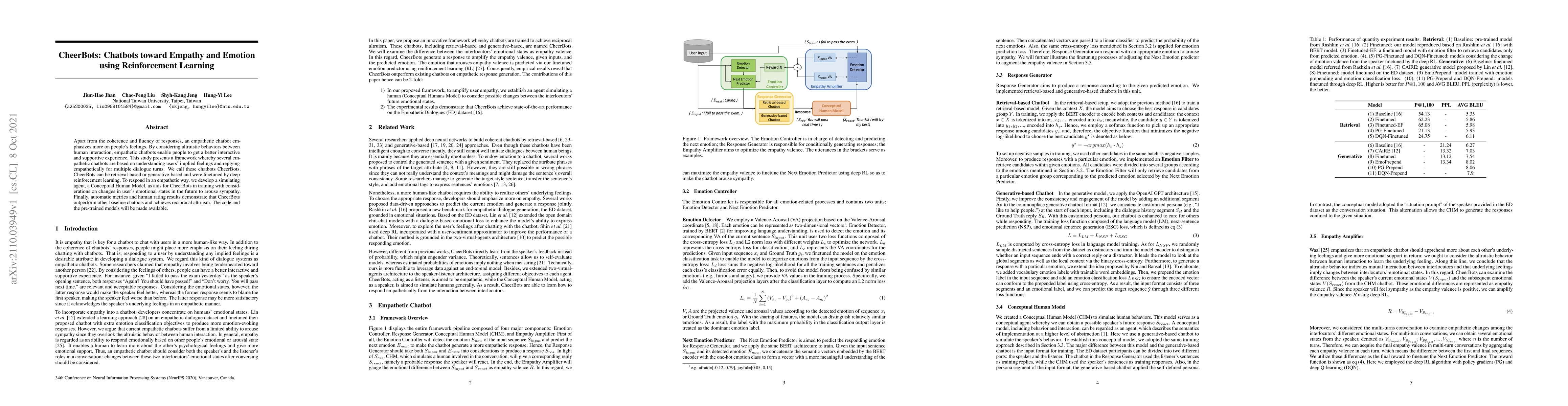 CheerBots, a type of chatbot, uses reinforcement learning to understand users' implied feelings and respond empathetically, outperforming baseline chatbots in demonstrating reciprocal altruism. The researchers created a framework that enables these empathetic chatbots to adapt to changes in user emotional states.