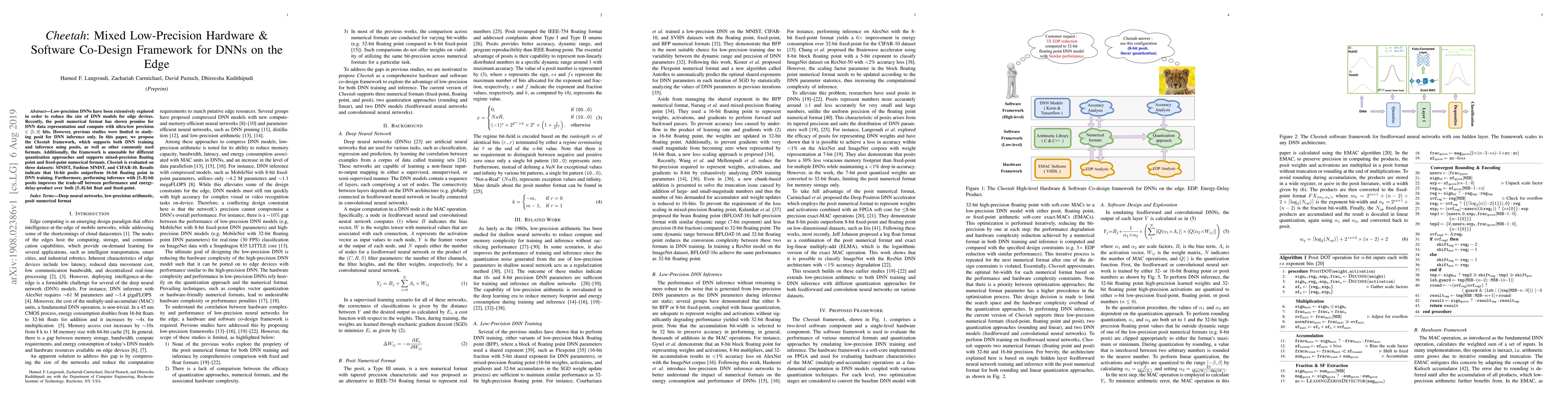 The Cheetah framework proposes a mixed low-precision hardware and software co-design approach for DNNs on edge devices, supporting both training and inference using posits and other numerical formats. Evaluations on MNIST, Fashion MNIST, and CIFAR-10 show posits outperform 16-bit floating point in training and provide better performance-energy trade-offs for inference.