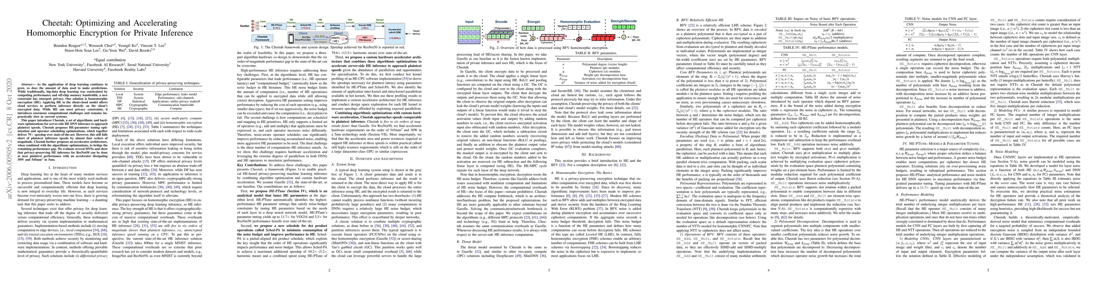Cheetah optimizes homomorphic encryption (HE) for private deep learning inference, achieving a 79x speedup through algorithmic and hardware optimizations. An accelerator architecture further closes the performance gap, enabling near-plaintext speeds for common neural network models.
