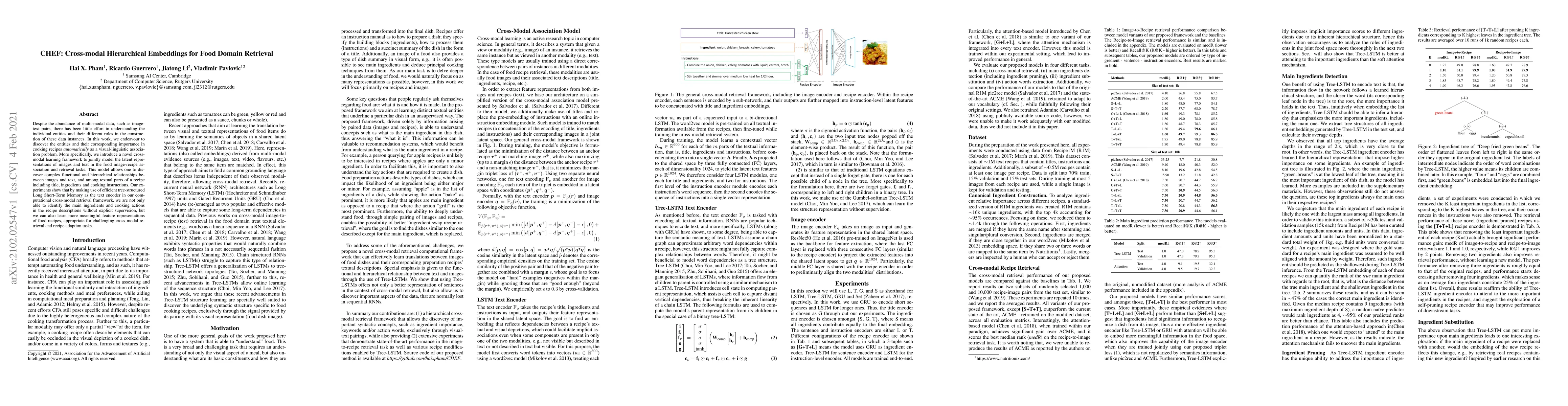This paper introduces CHEF, a cross-modal hierarchical embedding framework for food domain retrieval, which automatically discovers entities and their roles in cooking recipes. It employs a novel cross-modal learning approach to model image-text associations, enabling the identification of key ingredients and cooking actions, and improving feature representations for cross-modal retrieval and recipe adaptation.