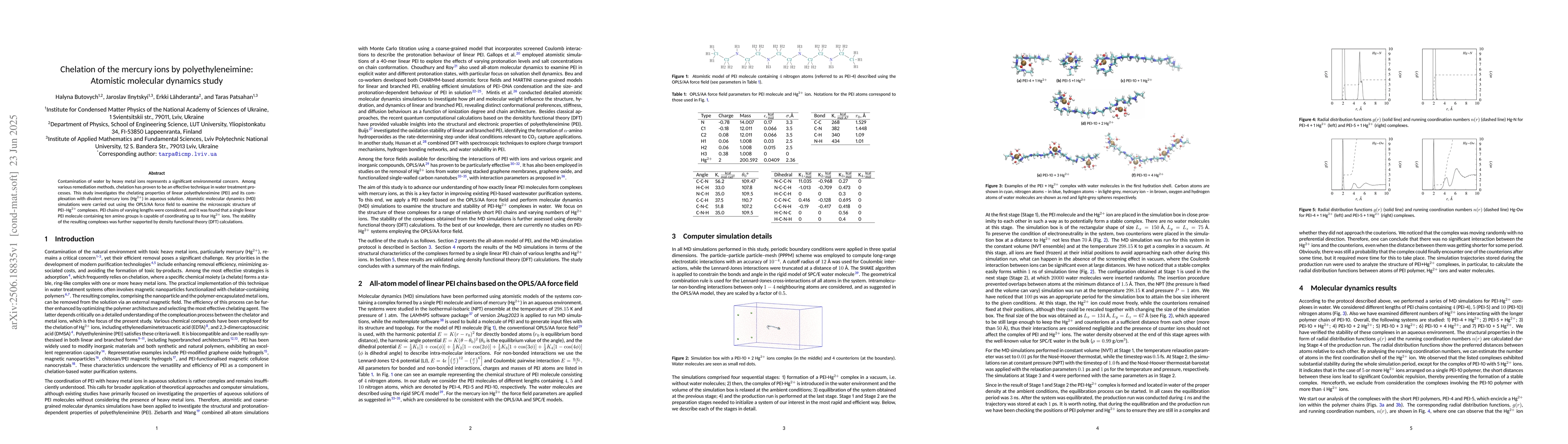 Contamination of water by heavy metal ions represents a significant environmental concern. Among various remediation methods, chelation has proven to be an effective technique in water treatment processes. This study investigates the chelating properties of linear polyethyleneimine (PEI) and its complexation with divalent mercury ions (Hg2+) in aqueous solution. Atomistic molecular dynamics (MD) simulations were carried out using the OPLS/AA force field to examine the microscopic structure of PEI-Hg2+ complexes. PEI chains of varying lengths were considered, and it was found that a single linear PEI molecule containing ten amino groups is capable of coordinating up to four Hg2+ ions. The stability of the resulting complexes was further supported by density functional theory (DFT) calculations.