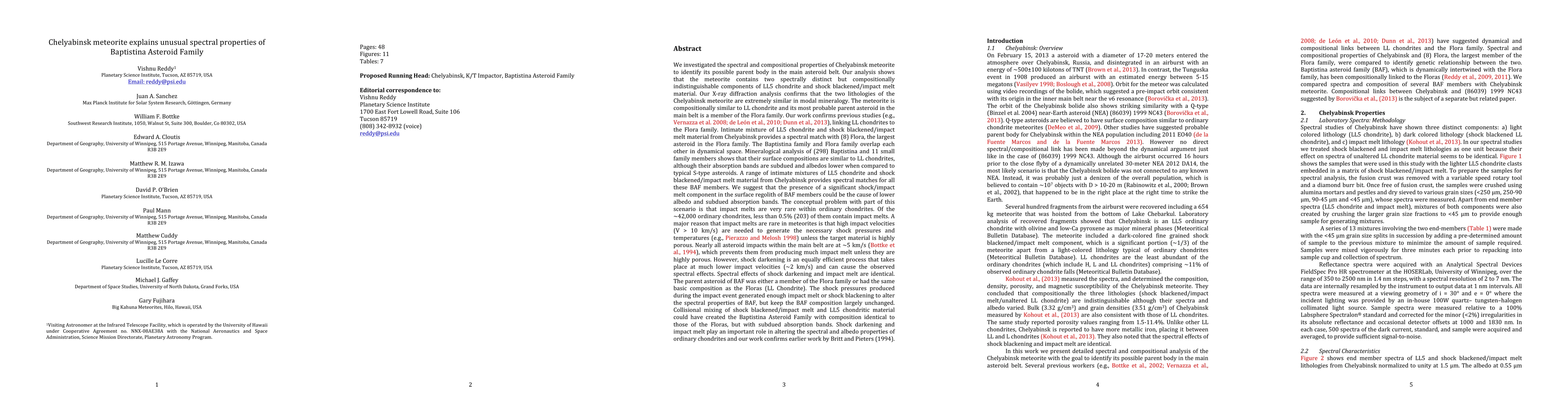 The Chelyabinsk meteorite's spectral and compositional analysis reveals it is likely from the Flora asteroid family, explaining the unusual spectral properties of the Baptistina asteroid family through shock/impact melt altering their surface composition. The spectral match between the meteorite and Baptistina family members suggests a shared compositional origin and significant impact-induced changes.