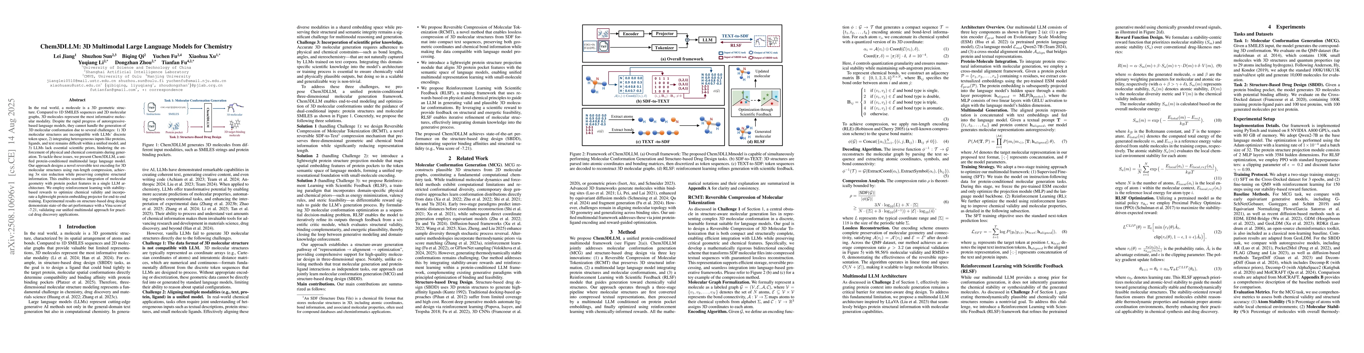 Chem3DLLM, a unified protein-conditioned multimodal large language model, is presented to handle 3D molecular conformation generation by addressing challenges such as 3D molecular structures' incompatibility with LLMs' discrete token space, integration of heterogeneous inputs, and lack of scientific priors. It employs a novel reversible text encoding for 3D molecular structures using run-length compression, reinforcement learning with stability-based rewards, and a lightweight protein embedding projector for end-to-end training.