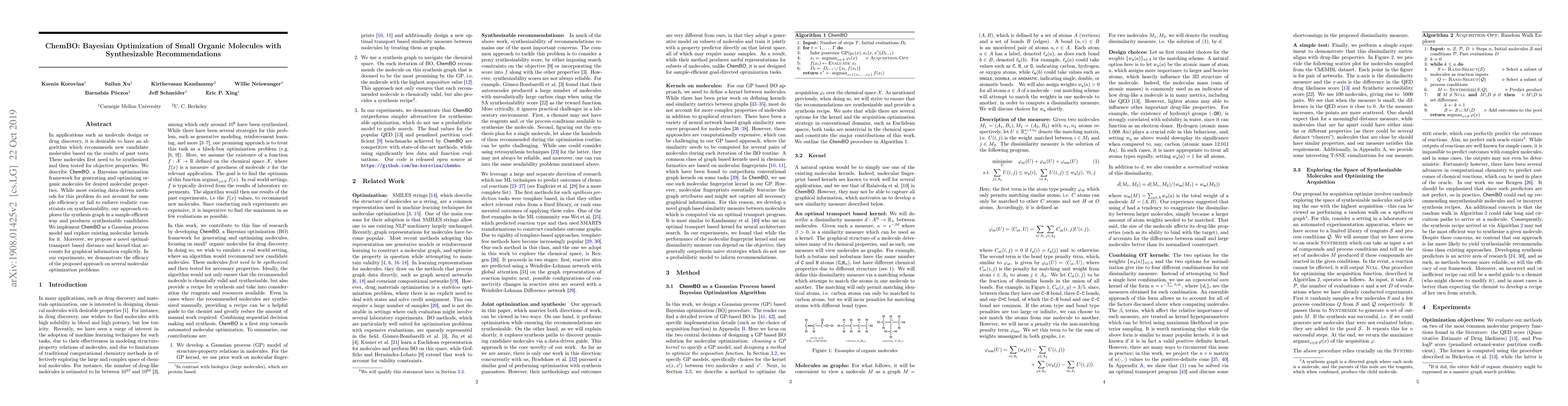 ChemBO employs Bayesian optimization to efficiently generate and optimize organic molecules for desired properties, ensuring the recommendations are synthesizable. It introduces a novel optimal-transport based kernel that explicitly considers molecular structure, demonstrating improved performance in molecular optimization tasks.
