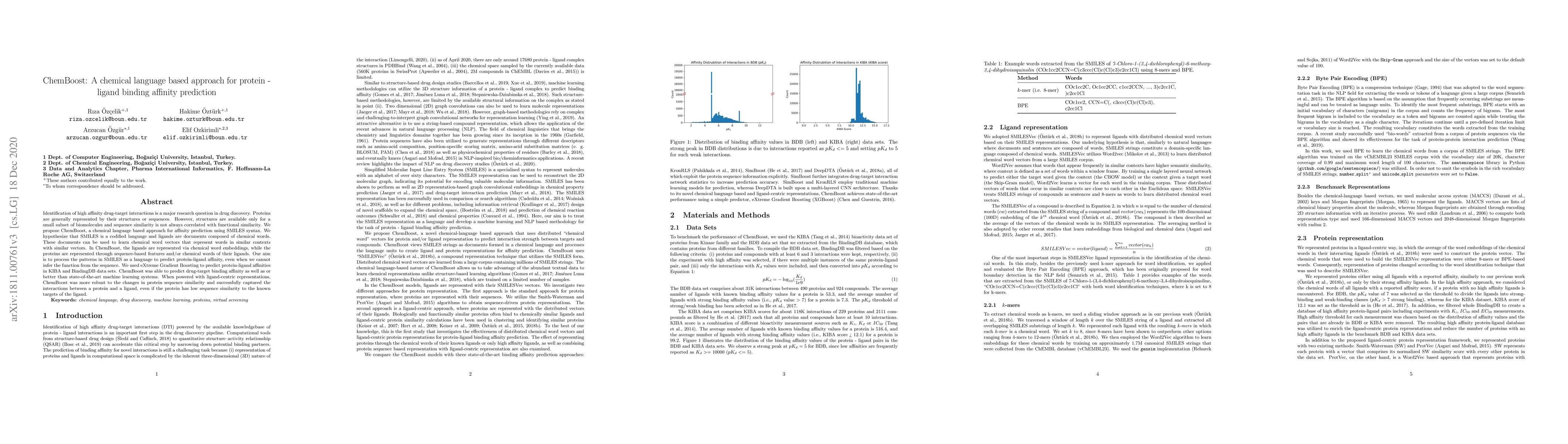 Identification of high affinity drug-target interactions is a major research question in drug discovery. Proteins are generally represented by their structures or sequences. However, structures are available only for a small subset of biomolecules and sequence similarity is not always correlated with functional similarity. We propose ChemBoost, a chemical language based approach for affinity prediction using SMILES syntax. We hypothesize that SMILES is a codified language and ligands are documents composed of chemical words. These documents can be used to learn chemical word vectors that represent words in similar contexts with similar vectors. In ChemBoost, the ligands are represented via chemical word embeddings, while the proteins are represented through sequence-based features and/or chemical words of their ligands. Our aim is to process the patterns in SMILES as a language to predict protein-ligand affinity, even when we cannot infer the function from the sequence. We used eXtreme Gradient Boosting to predict protein-ligand affinities in KIBA and BindingDB data sets. ChemBoost was able to predict drug-target binding affinity as well as or better than state-of-the-art machine learning systems. When powered with ligand-centric representations, ChemBoost was more robust to the changes in protein sequence similarity and successfully captured the interactions between a protein and a ligand, even if the protein has low sequence similarity to the known targets of the ligand.