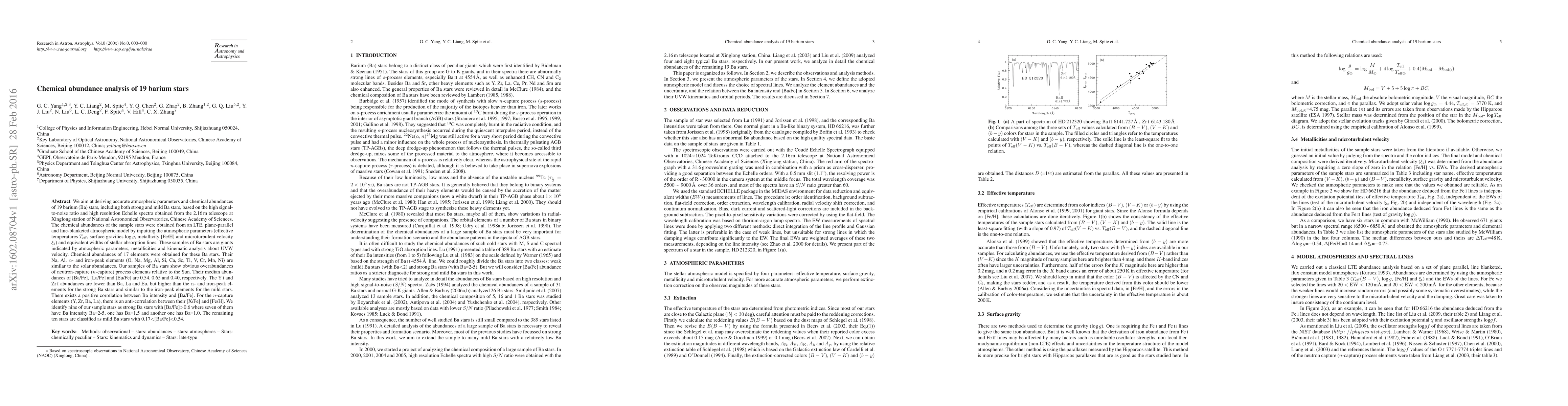 This study analyzes 19 barium stars for their chemical abundances, finding that they have overabundances of neutron-capture elements relative to the Sun, with some exhibiting strong Ba intensities and positive correlations between Ba and its abundance.