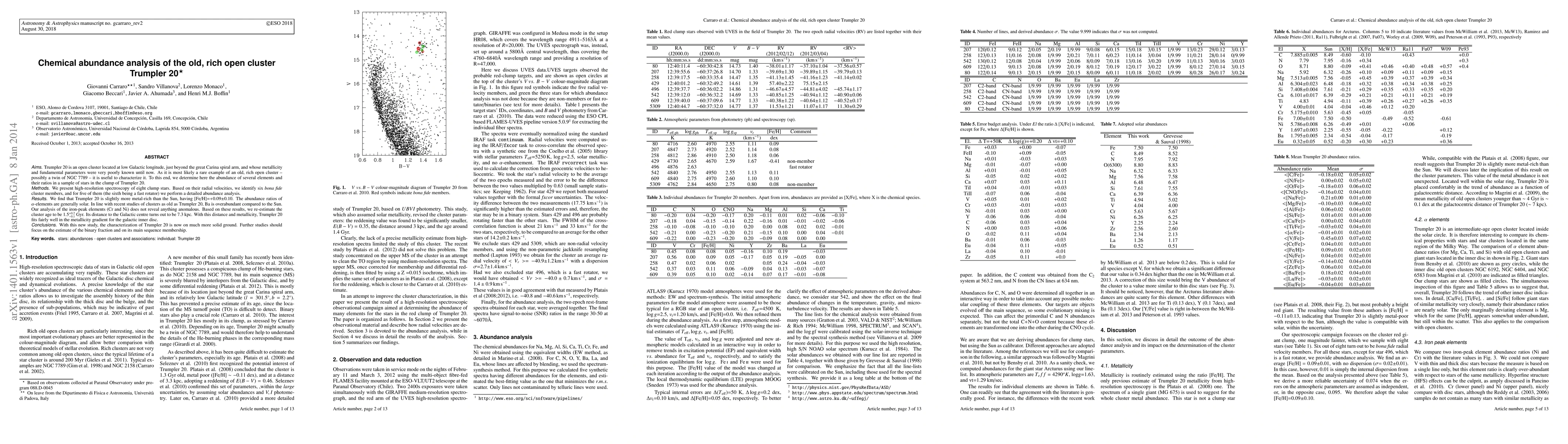 Trumpler 20 is an open cluster located at low Galactic longitude, just beyond the great Carina spiral arm, and whose metallicity and fundamental parameters were very poorly known until now. As it is most likely a rare example of an old, rich open cluster -- possibly a twin of NGC 7789 -- it is useful to characterize it. To this end, we determine here the abundance of several elements and their ratios in a sample of stars in the clump of Trumpler 20. The primary goal is to measure Trumpler 20 metallicity, so far very poorly constrained, and revise the cluster's fundamental parameters. We present high-resolution spectroscopy of eight clump stars. Based on their radial velocities, we identify six bona fide cluster members, and for five of them (the sixth being a fast rotator) we perform a detailed abundance analysis. We find that Trumpler 20 is slightly more metal-rich than the Sun, having [Fe/H]=+0.09$\pm$0.10. The abundance ratios of alpha-elements are generally solar. In line with recent studies of clusters as old as Trumpler 20, Ba is overabundant compared to the Sun. Our analysis of the iron-peak elements (Cr and Ni) does not reveal anything anomalous. Based on these results, we re-estimate the cluster age to be 1.5$^{+0.2}_{-0.1}$ Gyr. Its distance to the Galactic centre turns out to be 7.3 kpc. With this distance and metallicity, Trumpler 20 fits fairly well in the metallicity gradient for the galactic inner disc. With this new study, the characterization of Trumpler~20 is now on much more solid ground. Further studies should focus on the estimate of the binary fraction and on its main sequence membership.