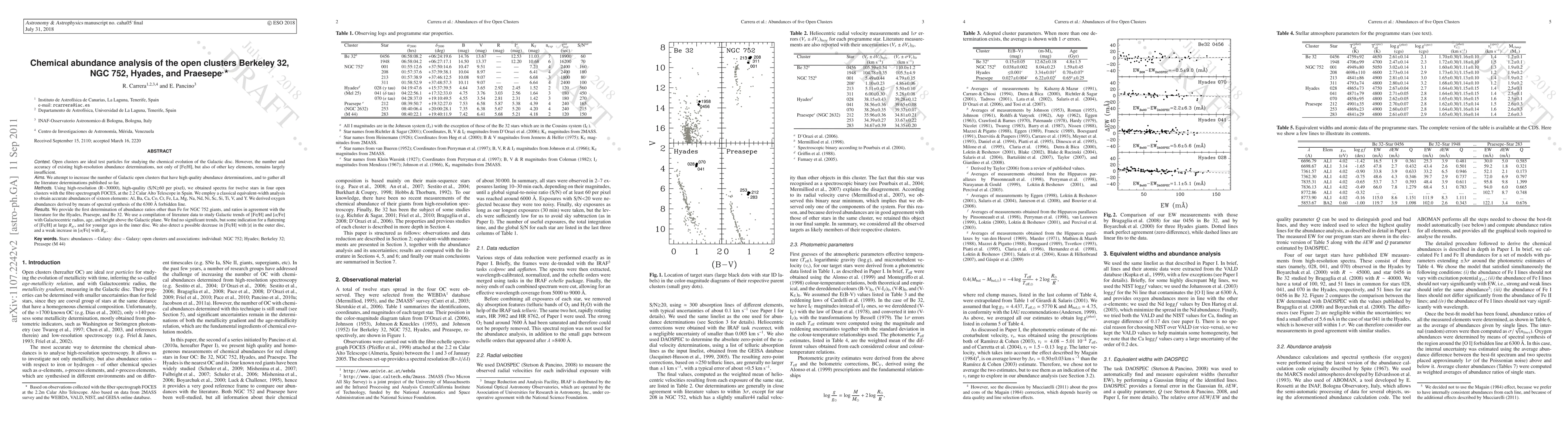 Context. Open clusters are ideal test particles to study the chemical evolution of the Galactic disc. However the existing high-resolution abundance determinations, not only of [Fe/H], but also of other key elements, is largely insufficient at the moment. Aims. To increase the number of Galactic open clusters with high quality abundance determinations, and to gather all the literature determinations published so far. Methods. Using high-resolution (R~30000), high-quality (S/N$>60 per pixel), we obtained spectra for twelve stars in four open clusters with the fiber spectrograph FOCES, at the 2.2 Calar Alto Telescope in Spain. We use the classical equivalent widths analysis to obtain accurate abundances of sixteen elements: Al, Ba, Ca, Co, Cr, Fe, La, Mg, Na, Nd, Ni, Sc, Si, Ti, V, Y. Oxygen abundances have been derived through spectral synthesis of the 6300 A forbidden line. Results. We provide the first determination of abundance ratios other than Fe for NGC 752 giants, and ratios in agreement with the literature for the Hyades, Praesepe and Be 32. We use a compilation of literature data to study Galactic trends of [Fe/H] and [alpha/Fe] with Galactocentric radius, age, and height above the Galactic plane. We find no significant trends, but some indication for a flattening of [Fe/H] at large Rgc, and for younger ages in the inner disc. We also found a possible decrease of [Fe/H] with |z| in the outer disc, and a weak increase of [alpha/Fe] with Rgc.