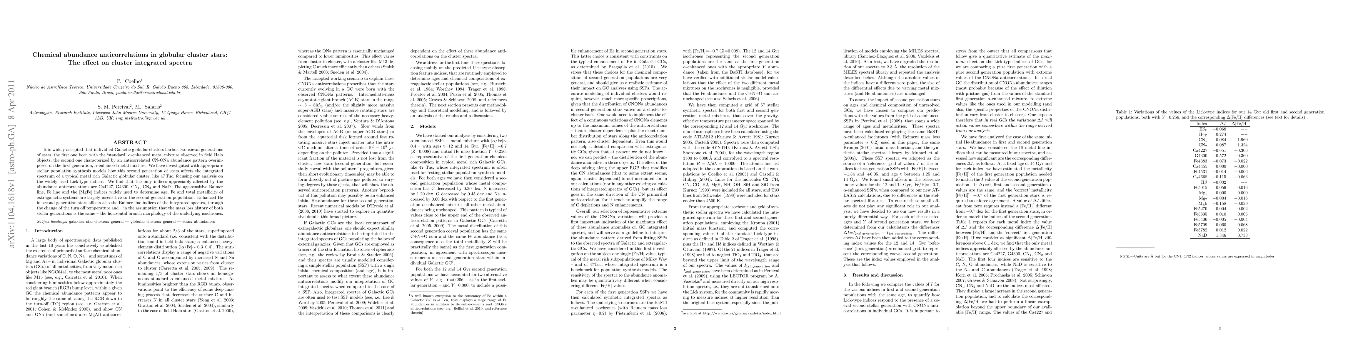 It is widely accepted that individual Galactic globular clusters harbor two coeval generations of stars, the first one born with the `standard' $\alpha$-enhanced metal mixture observed in field Halo objects, the second one characterized by an anticorrelated CN-ONa abundance pattern overimposed on the first generation, $\alpha$-enhanced metal mixture. We have investigated with appropriate stellar population synthesis models how this second generation of stars affects the integrated spectrum of a typical metal rich Galactic globular cluster, like 47\,Tuc, focusing our analysis on the widely used Lick-type indices. We find that the only indices appreciably affected by the abundance anticorrelations are Ca4227, G4300, ${\rm CN_1}$, ${\rm CN_2}$ and NaD. The age-sensitive Balmer line, Fe line and the [MgFe] indices widely used to determine age, Fe and total metallicity of extragalactic systems are largely insensitive to the second generation population. Enhanced He in second generation stars affects also the Balmer line indices of the integrated spectra, through the change of the turn off temperature and -- in the assumption that the mass loss history of both stellar generations is the same -- the horizontal branch morphology of the underlying isochrones.