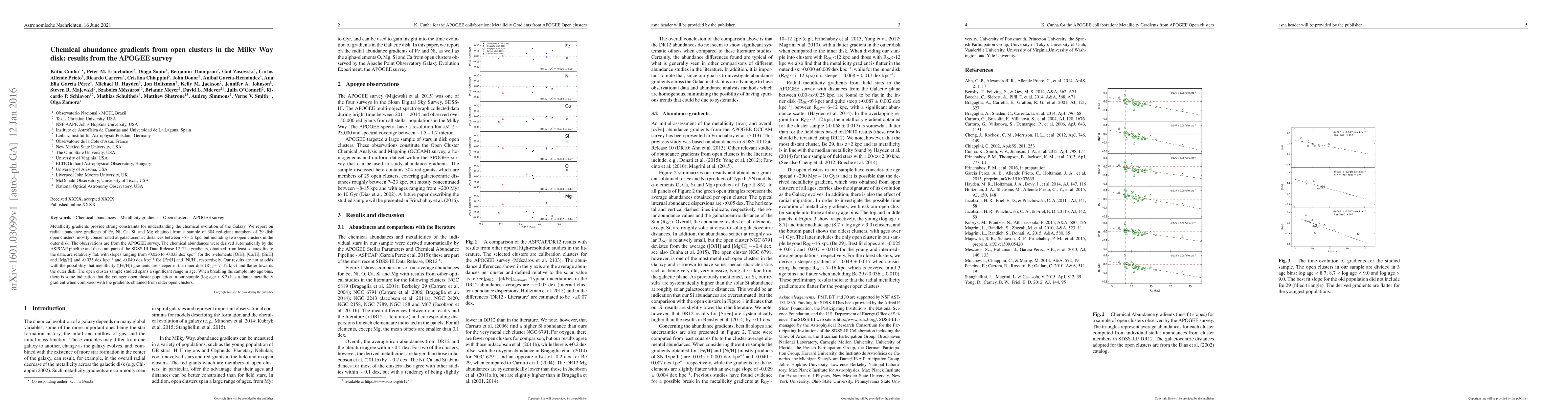 This paper reports on radial abundance gradients of Fe, Ni, Ca, Si, and Mg from 29 Milky Way disk open clusters, mostly within 8-15 kpc, using APOGEE survey data. The gradients are relatively flat, ranging from -0.026 to -0.040 dex/kpc, suggesting that metallicity gradients may be steeper in the inner disk and flatter in the outer disk. Younger open clusters show flatter gradients compared to older ones.