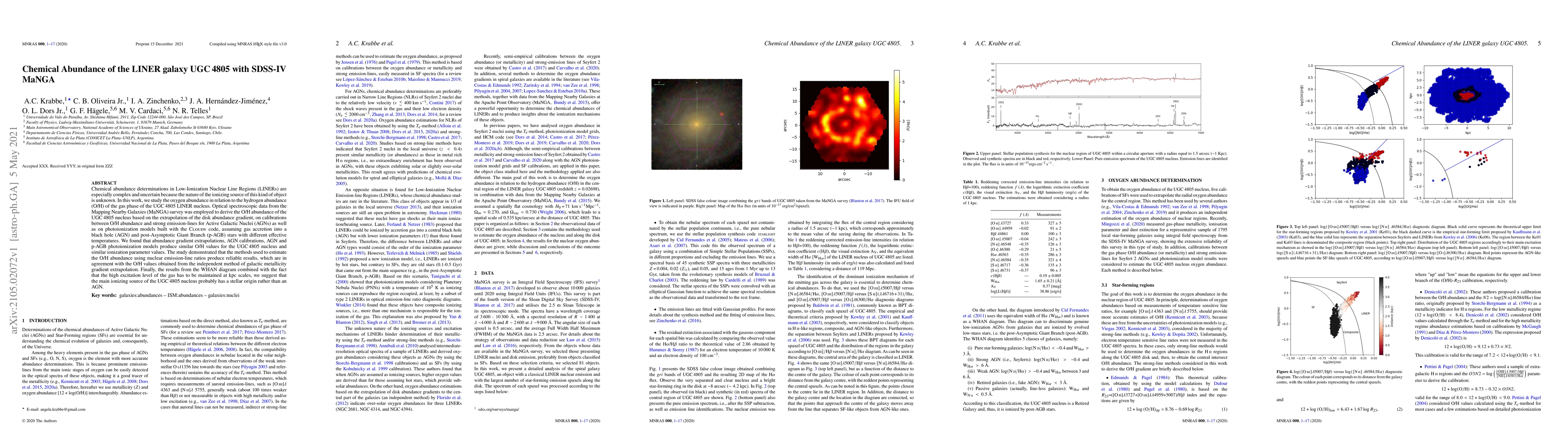 Chemical abundance determinations in Low-Ionization Nuclear Line Regions (LINERs) are especially complex and uncertain because the nature of the ionizing source of this kind of object is unknown. In this work, we study the oxygen abundance in relation to the hydrogen abundance (O/H) of the gas phase of the UGC4805 LINER nucleus. Optical spectroscopic data from the Mapping Nearby Galaxies (MaNGA) survey was employed to derive the O/H abundance of the UGC4805 nucleus based on the extrapolation of the disk abundance gradient, on calibrations between O/H abundance and strong emission-lines for Active Galactic Nuclei (AGNs) as well as on photoionization models built with the Cloudy code, assuming gas accretion into a black hole (AGN) and post-Asymptotic Giant Branch (p-AGB) stars with different effective temperatures. We found that abundance gradient extrapolations, AGN calibrations, AGN and p-AGB photoionization models produce similar O/H values for the UGC4805 nucleus and similar ionization parameter values. The study demonstrated that the methods used to estimate the O/H abundance using nuclear emission-line ratios produce reliable results, which are in agreement with the O/H values obtained from the independent method of galactic metallicity gradient extrapolation. Finally, the results from the WHAN diagram combined with the fact that the high excitation level of the gas has to be maintained at kpc scales, we suggest that the main ionizing source of the UGC4805 nucleus probably has a stellar origin rather than an AGN.