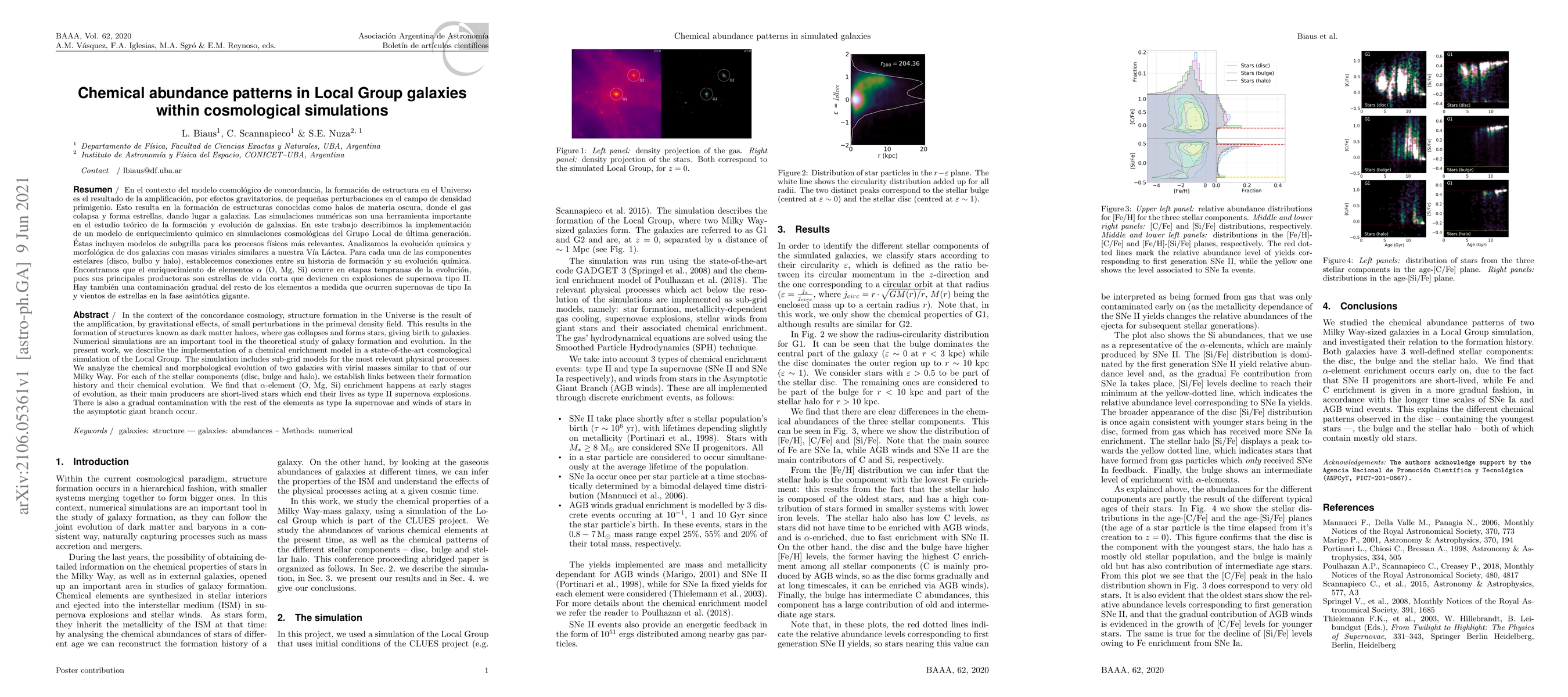 This research employs a cosmological simulation to study the chemical abundance patterns in Local Group galaxies, focusing on the formation history and chemical evolution of two galaxies similar to the Milky Way. The study reveals that $\alpha$-elements are enriched early due to short-lived stars ending as type II supernovae, while gradual contamination occurs later from type Ia supernovae and stellar winds.