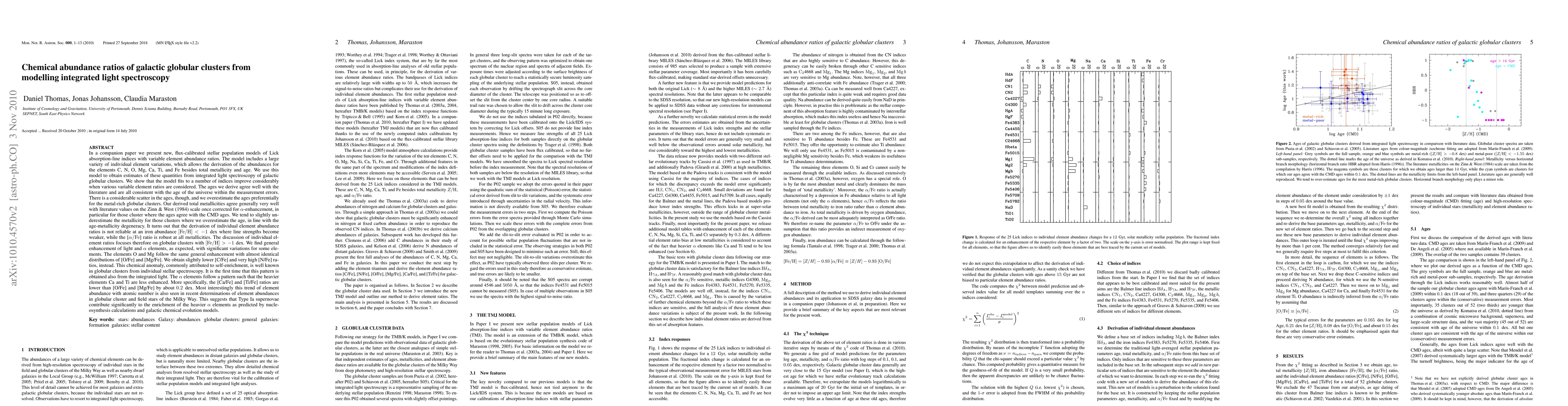 This study uses a new stellar population model to analyze integrated light spectroscopy of galactic globular clusters, deriving ages, metallicities, and element abundance ratios. The derived ages mostly agree with literature values but show larger ages than those from color-magnitude diagrams, especially for metal-rich clusters. The study finds a general enhancement of light and alpha elements, with notable variations, particularly high [N/Fe] ratios, and a trend where heavier alpha elements like Ca and Ti are less enhanced than O and Mg.