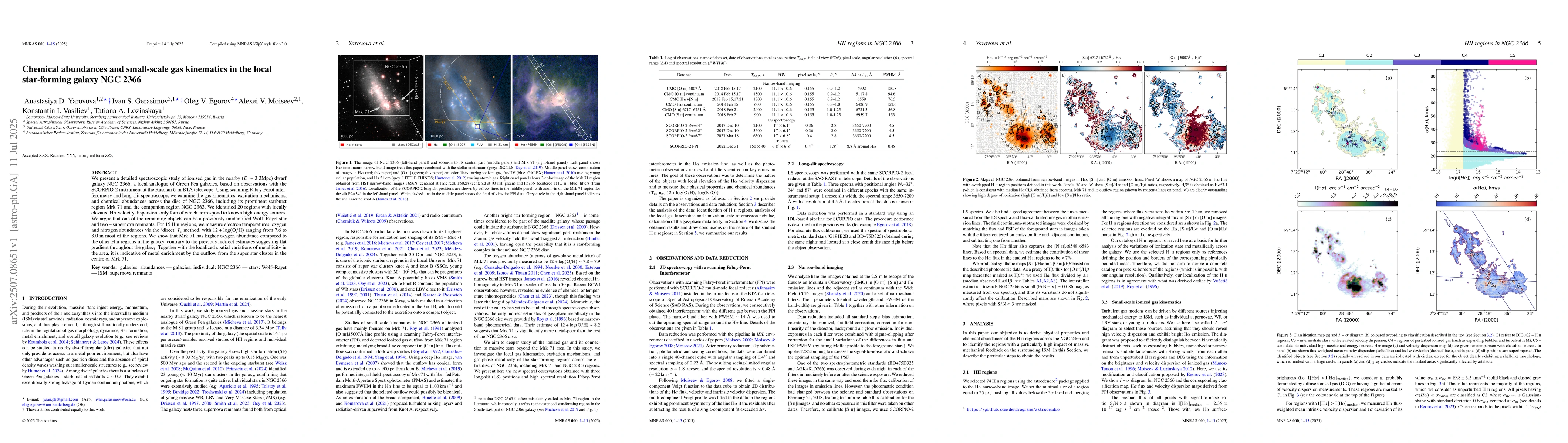 We present a detailed spectroscopic study of ionised gas in the nearby (~3.3Mpc) dwarf galaxy NGC 2366, a local analogue of Green Pea galaxies, based on observations with the SCORPIO-2 instrument at the Russian 6-m BTA telescope. Using scanning Fabry-Perot interferometry and long-slit spectroscopy, we examine the gas kinematics, excitation mechanisms, and chemical abundances across the disc of NGC 2366, including its prominent starburst region Mrk 71 and the companion region NGC 2363. We identified 20 regions with locally elevated Ha velocity dispersion, only four of which correspond to known high-energy sources. We argue that one of the remaining objects can be a previously unidentified Wolf-Rayet star and two - supernova remnants. For 15 HII regions, we measure electron temperatures, oxygen and nitrogen abundances via the `direct' Te method, with 12 + log(O/H) ranging from 7.6 to 8.0 in most of the regions. We show that Mrk 71 has higher oxygen abundance compared to the other \HII regions in the galaxy, contrary to the previous indirect estimates suggesting flat gradient throughout the galaxy. Together with the localized spatial variations of metallicity in the area, it is indicative of metal enrichment by the outflow from the super star cluster in the centre of Mrk 71.
