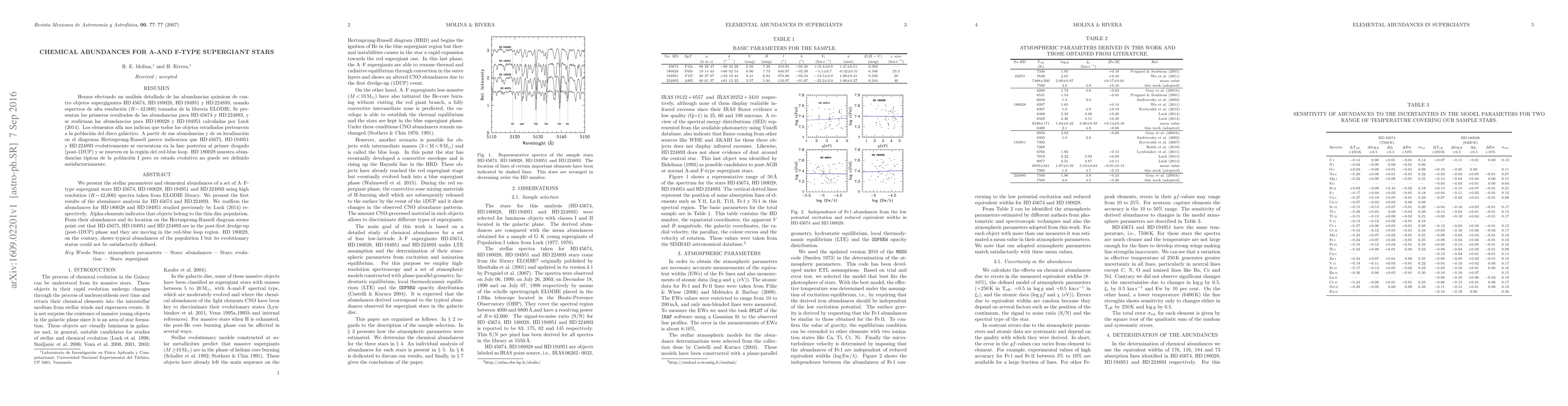 We present the stellar parameters and elemental abundances of a set of A--F-type supergiant stars HD\,45674, HD\,180028, HD\,194951 and HD\,224893 using high resolution ($R$\,$\sim$\,42,000) spectra taken from ELODIE library. We present the first results of the abundance analysis for HD\,45674 and HD\,224893. We reaffirm the abundances for HD\,180028 and HD\,194951 studied previously by Luck (2014) respectively. Alpha-elements indicates that objects belong to the thin disc population. From their abundances and its location on the Hertzsprung-Russell diagram seems point out that HD\,45675, HD\,194951 and HD\,224893 are in the post-first dredge-up (post-1DUP) phase and they are moving in the red-blue loop region. HD~180028, on the contary, shows typical abundances of the population I but its evolutionary status could not be satisfactorily defined.