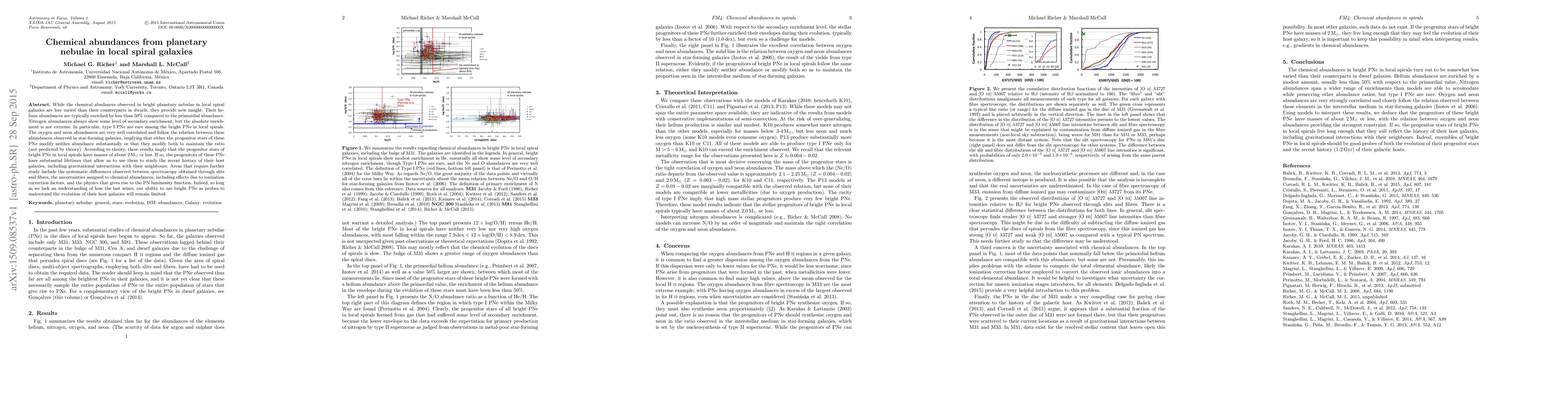 While the chemical abudances observed in bright planetary nebulae in local spiral galaxies are less varied than their counterparts in dwarfs, they provide new insight. Their helium abundances are typically enriched by less than 50\% compared to the primordial abundance. Nitrogen abundances always show some level of secondary enrichment, but the absolute enrichment is not extreme. In particular, type I PNe are rare among the bright PNe in local spirals. The oxygen and neon abundances are very well correlated and follow the relation between these abundances observed in star-forming galaxies, implying that either the progenitor stars of these PNe modify neither abundance substantially or that they modify both to maintain the ratio (not predicted by theory). According to theory, these results imply that the progenitor stars of bright PNe in local spirals have masses of about $2\,\mathrm M_{\odot}$ or less. If so, the progenitors of these PNe have substantial lifetimes that allow us to use them to study the recent history of their host galaxies, including gravitational interactions with their neighbours. Areas that require further study include the systematic differences observed between spectroscopy obtained through slits and fibres, the uncertainties assigned to chemical abundances, including effects due to ionization correction factors, and the physics that gives rise to the PN luminosity function. Indeed, so long as we lack an understanding of how the last arises, our ability to use bright PNe as probes to understand the evolution of their host galaxies will remain limited.