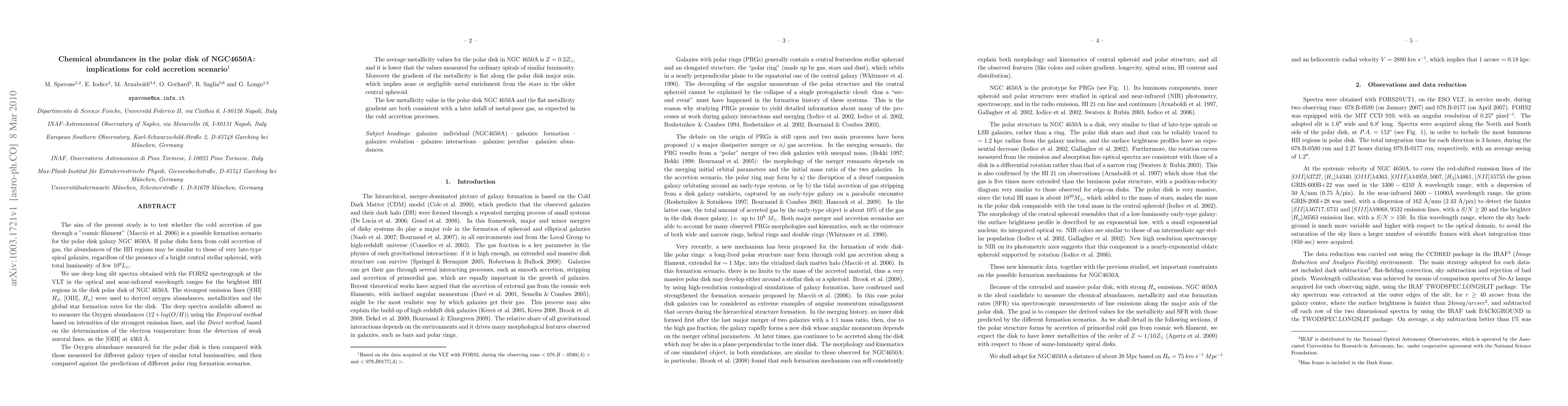 This study investigates the chemical abundances in the polar disk of NGC 4650A to test the cold accretion scenario for its formation. The results show low metallicity and a flat metallicity gradient, consistent with metal-poor gas accretion, supporting the cold accretion model over other formation scenarios.