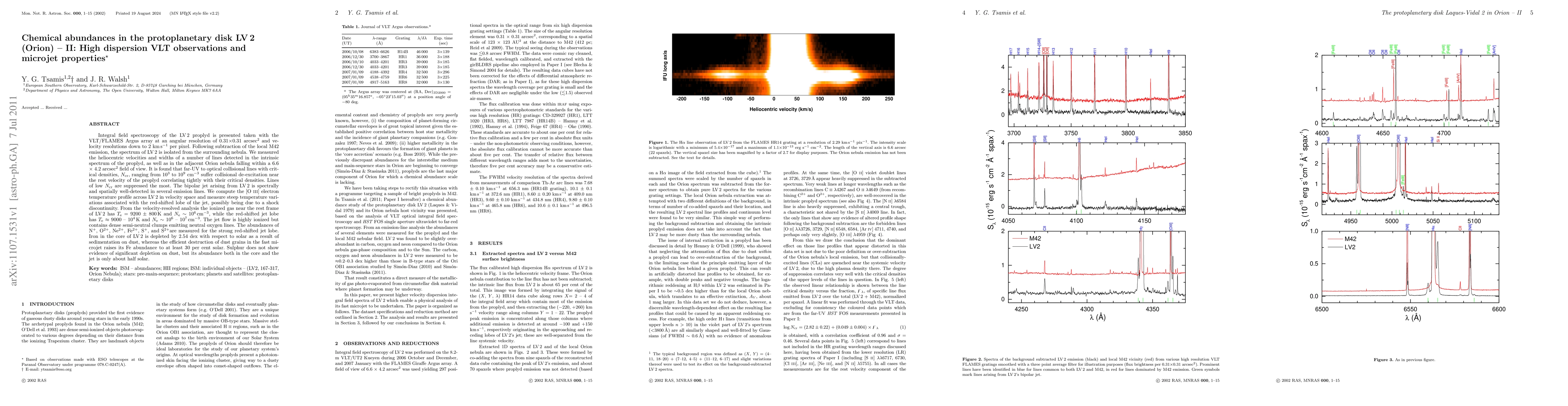 Integral field spectroscopy of the LV2 proplyd is presented taken with the VLT/FLAMES Argus array at an angular resolution of 0.31x0.31 arcsec^2 and velocity resolutions down to 2 km/s per pixel. Following subtraction of the local M42 emission, the spectrum of LV2 is isolated from the surrounding nebula. We measured the heliocentric velocities and widths of a number of lines detected in the intrinsic spectrum of the proplyd, as well as in the adjacent Orion nebula within a 6.6 x 4.2 arcsec^2 FoV. It is found that far-UV to optical collisional lines with critical densities, Ncrit, ranging from 10^3 to 10^9 /cm^3 suffer collisional de-excitation near the rest velocity of the proplyd correlating tightly with their critical densities. Lines of low Ncrit are suppressed the most. The bipolar jet arising from LV2 is spectrally and spatially well-detected in several emission lines. We compute the [O III] electron temperature profile across LV2 in velocity space and measure steep temperature variations associated with the red-shifted lobe of the jet, possibly being due to a shock discontinuity. From the velocity-resolved analysis the ionized gas near the rest frame of LV2 has Te = 9200 +/- 800 K and Ne ~ 10^6 /cm^3, while the red-shifted jet lobe has Te ~ 9000 - 10^4 K and Ne ~ 10^6 - 10^7 /cm^3. The jet flow is highly ionized but contains dense semi-neutral clumps emitting neutral oxygen lines. The abundances of N+, O++, Ne++, Fe++, S+, and S++ are measured for the strong red-shifted jet lobe. Iron in the core of LV2 is depleted by 2.54 dex with respect to solar as a result of sedimentation on dust, whereas the efficient destruction of dust grains in the fast microjet raises its Fe abundance to at least 30 per cent solar. Sulphur does not show evidence of significant depletion on dust, but its abundance both in the core and the jet is only about half solar.